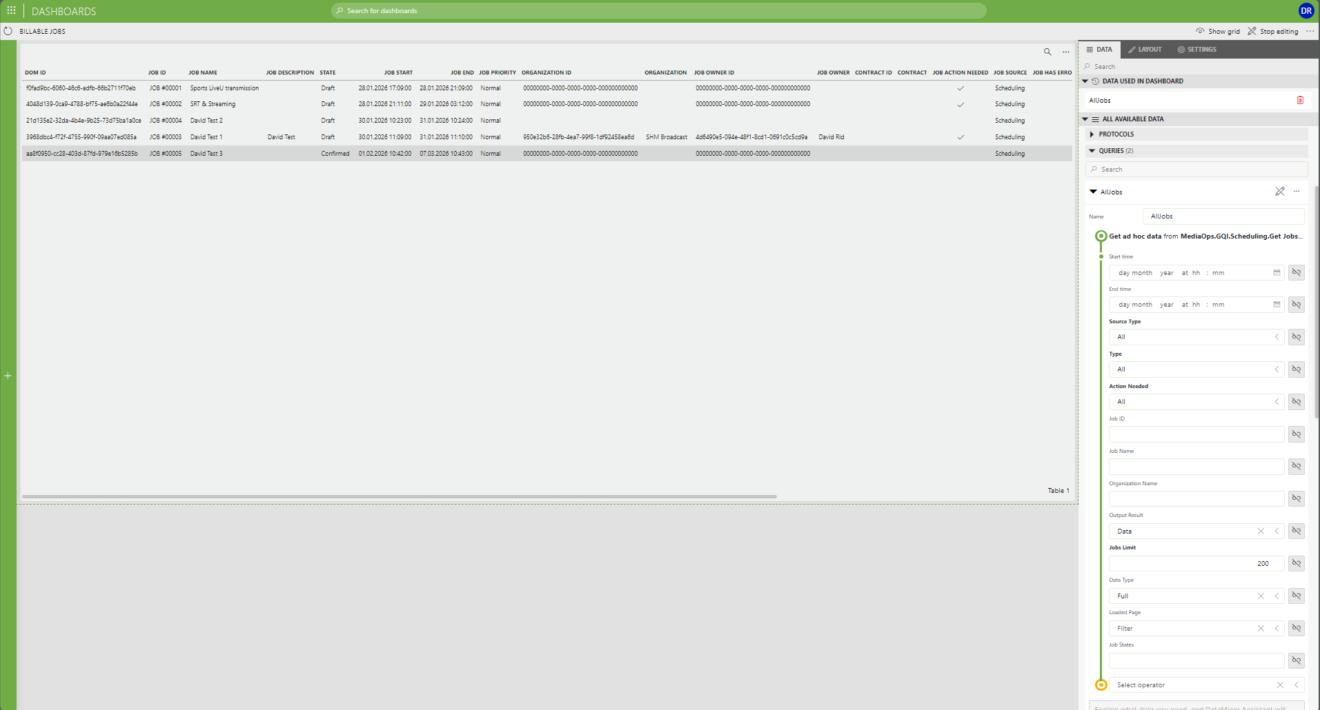 Long answer, if you are familiar with DOM and writing custom Ad Hoc DataSources, you can do it. You would need to retrieve the Property Values instances from the (slc)properties DOM Module that have a Property Value section with Property Name field 'IsBillable' and Value field 'true'. Each Property Values instance can be seen as the link between a property and an object in MediaOps (such as a Job). This kind of filtering is not possible by default from Low Code Apps as they are implemented as so-called multisections (= every Property Values instance can contain multiple Property Value sections). Once you have that list of Property Values instances you should use their Linked Object ID field to retrieve the IDs of the Jobs to which those properties are assigned.