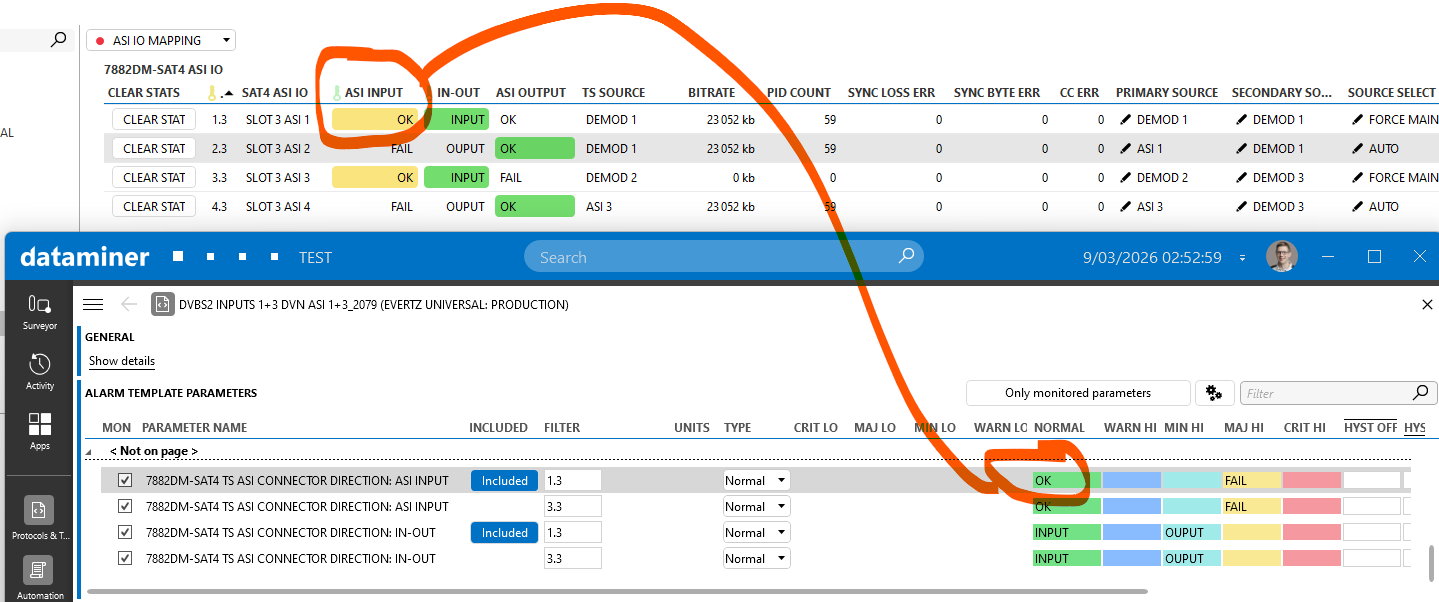 You can see in the screenshots that ASI INPUT, OK should have a normal value and FAIL should have the Major Yellow.