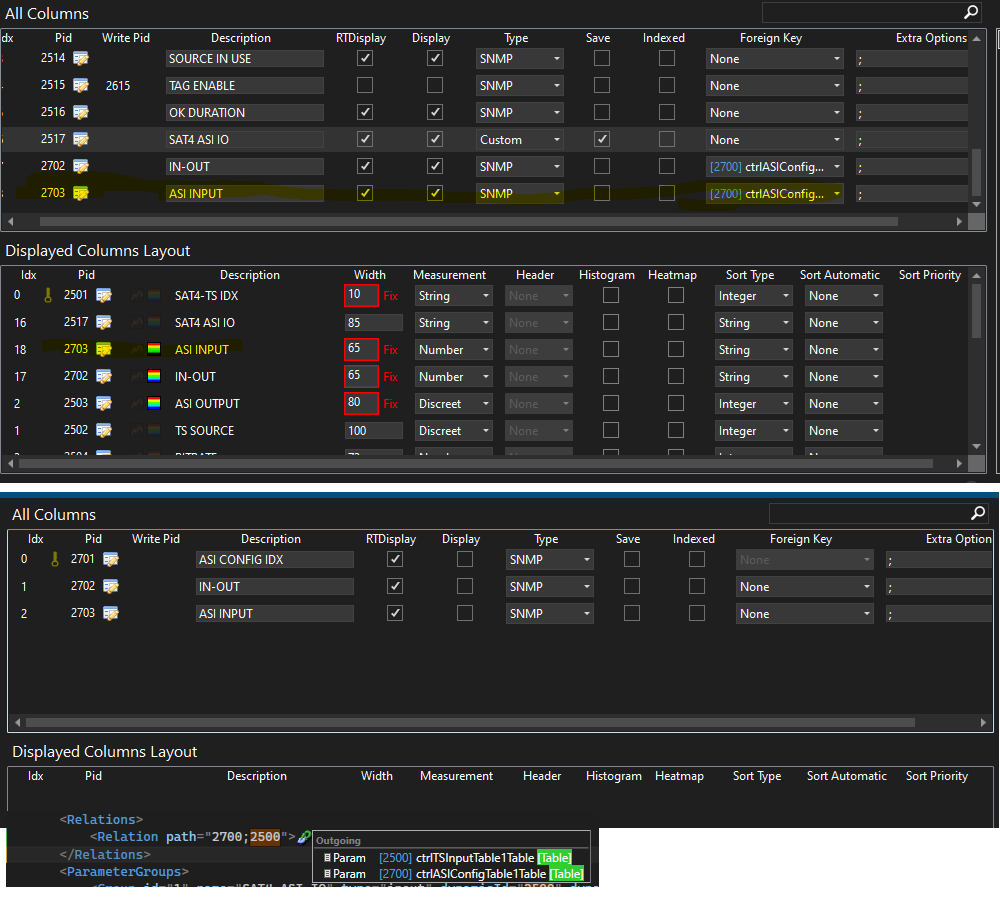 Parameter 2703 "ASI INPUT" is displayed as part of table 2500, with the foreign key 2700.