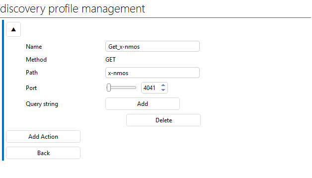 I have an NMOS registry (GV Orbit) running on a device on port 4041. In Admin -> Discovery -> Discovery Profiles I have created a profile called Get_x-nmos. this is configured to GET /x-nmos from the end device on 4041. I create a scan range, that is just my device of interest