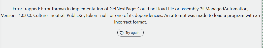 Hi Joel, SLManagedAutomation is 32bit whereas the process that executes the ad hoc datasource is 64 bit. (see also ad-hoc datasource assembly load issue).