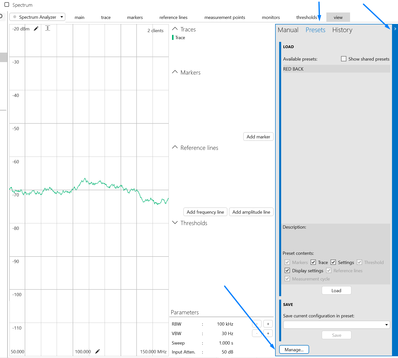 After configuring your new preset, you will then need to head to your LCA. You will be able to find your presets in the “Spectrum Presets” tab by filtering the protocol where you saved your desired configuration (you may need to refresh your page). Then you can drag and drop your present onto your Spectrum Analyzer, applying your configurations.