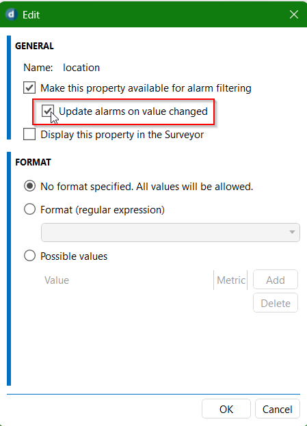For other options (e.g., property(view.location)), you need to ensure that the property is configured to update the alarms on value change.