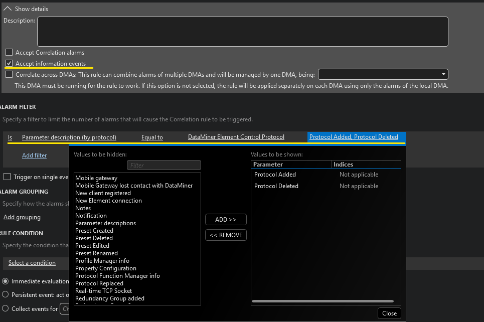 I would like to set up a correlation rule which would trigger my script each time a protocol is added or deleted from the DMS.