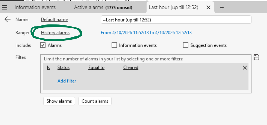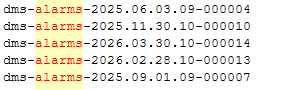 The historic or closed alarms are moved to the indices that start with <DBPREFIX>-alarms-*, as shown in the following example: