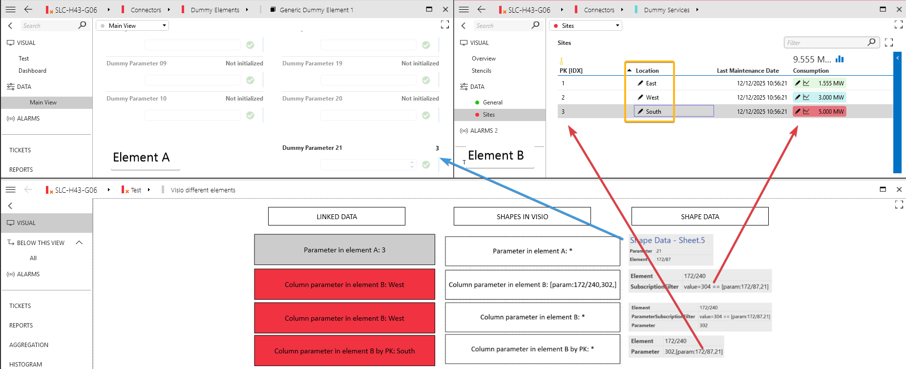 You can use the SubscriptionFilter shape data, which is commonly used when filtering data. The filter references the first column in Element B and compares it with a value from Element A (via a param placeholder) (e.g. value=304 == [param:172/87,21]). After applying the correct filter, you can use the same placeholder in the shape text to display the second column from Element B (e.g. [param:172/240,302,]).