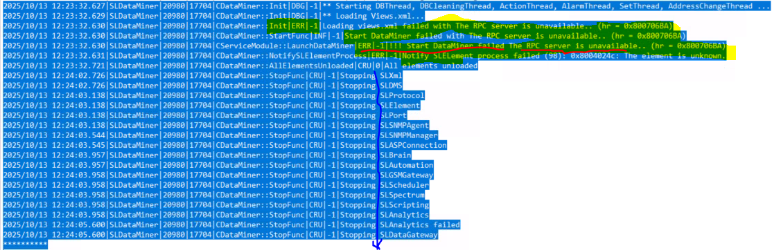 2025/10/13 12:23:32.630|SLDataMiner|20980|17704|CServiceModule::LaunchDataMiner|ERR|-1|!!! Start DataMiner failed The RPC server is unavailable.. (hr = 0x800706BA)