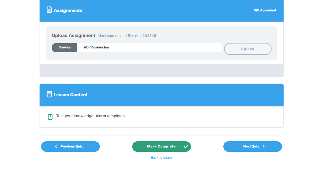 Uploading a screenshot of your completed exercise is optional. However, if a lesson includes a quiz, you’ll first need to take the quiz before the ‘Completed’ button becomes available.