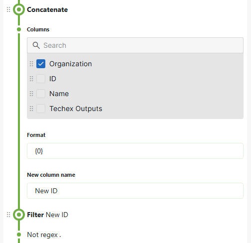 Before the new Filter operation, add a "Column Manipulation" operation to create a copy of your existing ID column. Then this new column should have the Not Regex option.