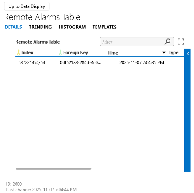 The alarm information is located under the “Remote Alarm Tables” with ID: 2600. This is a dynamic table that only displays active alarms for an element. If no alarms are present, the table remains empty.