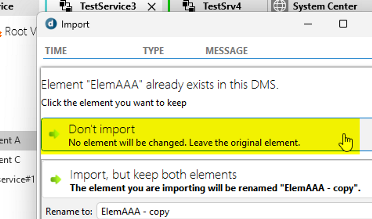 This is why the service ends up being created without any elements: there is a conflict in the element names, and the option chosen was ‘Don’t import’: