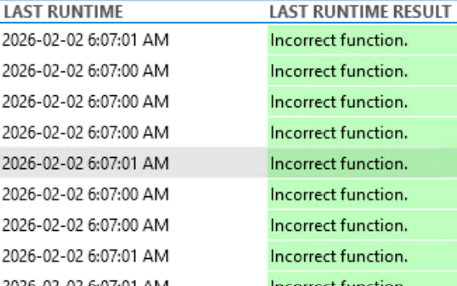 Recently, ~900+ concurrent tasks were created and upon execution, they all failed with a LAST RUNTIME RESULT of "Incorrect function".