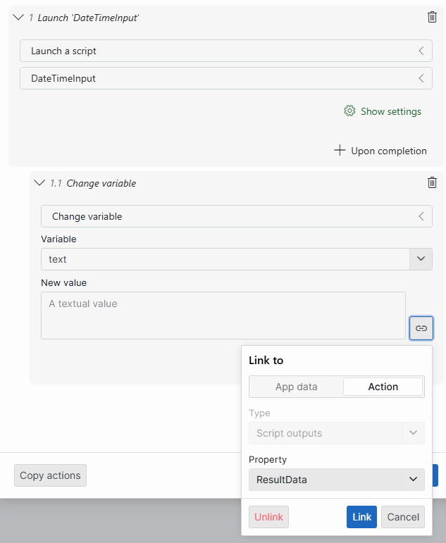 I’ve edited my low-code app. Instead of using a table, I’m now displaying a text field. In the text field settings, I added: {VARIABLE.ResultData.Value} After running the automation script, nothing shows up
