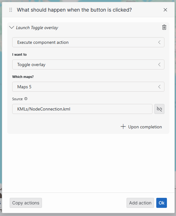 Additionally, I have several KML files that need to be toggled at the same time. Can we just define the directory of the KML files in the Source field, or do we need to configure multiple Launch Toggle Overlay actions in the button settings?