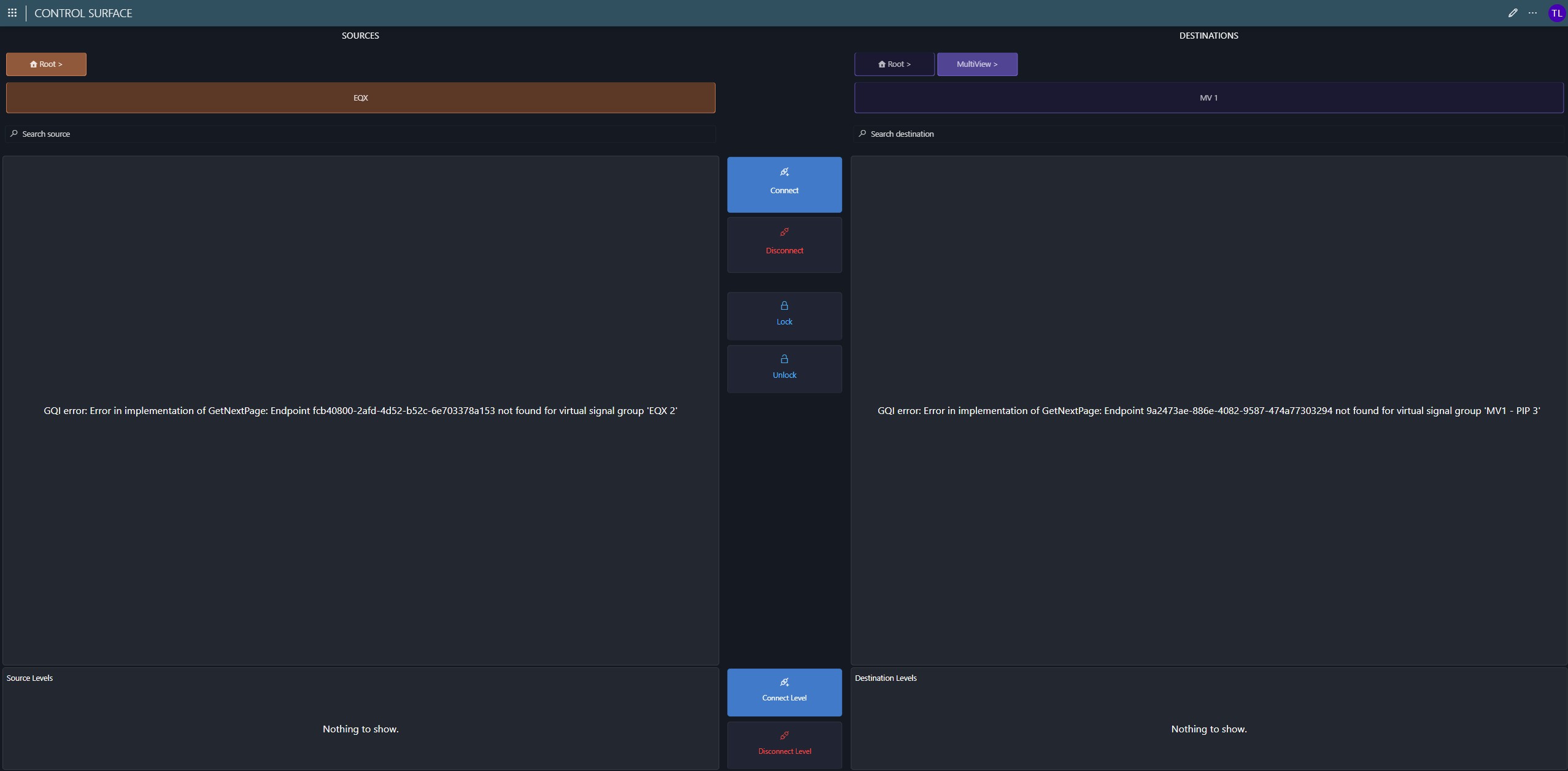 After a very basic test configuration with MediaOps Live which includes: Enpoints, Levels, VSGs and Categories, the Control Surface is giving me this kind of error: