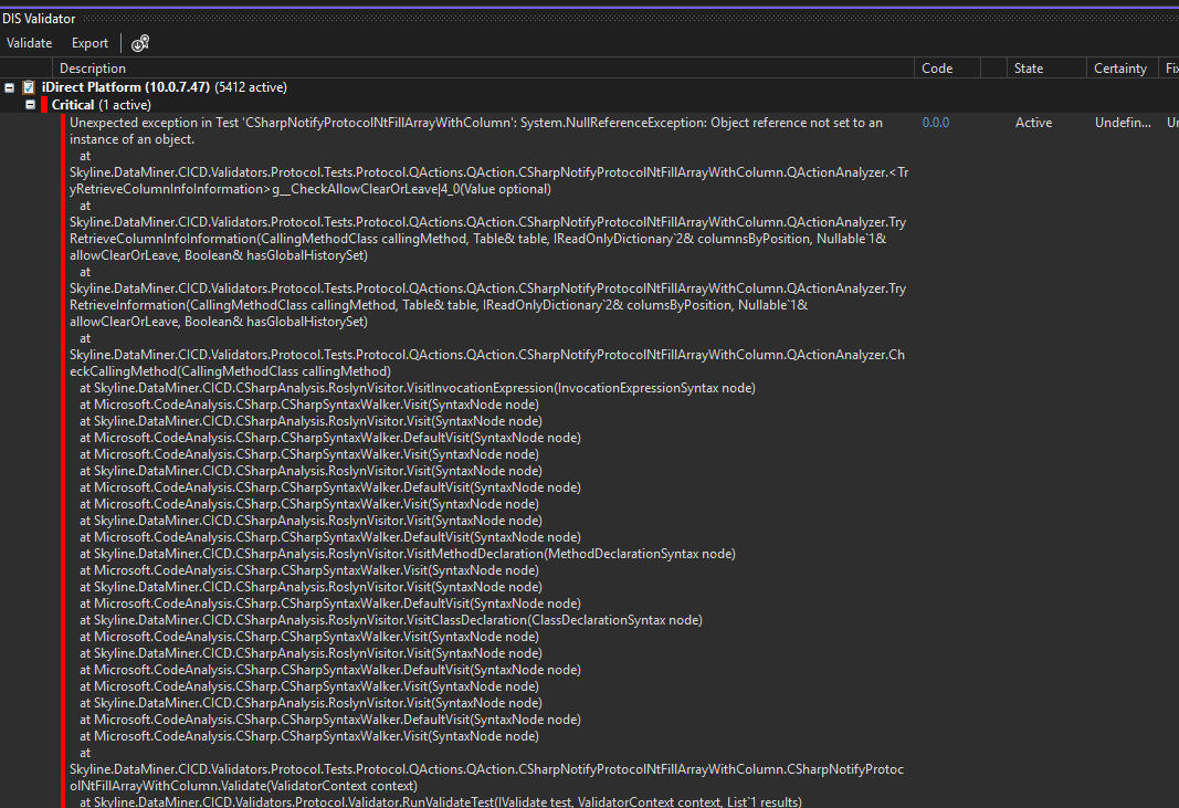 at Skyline.DataMiner.CICD.Validators.Protocol.Validator.RunValidateTest(IValidate test, ValidatorContext context, List`1 results) (line 0 col 0) [0.0.0]