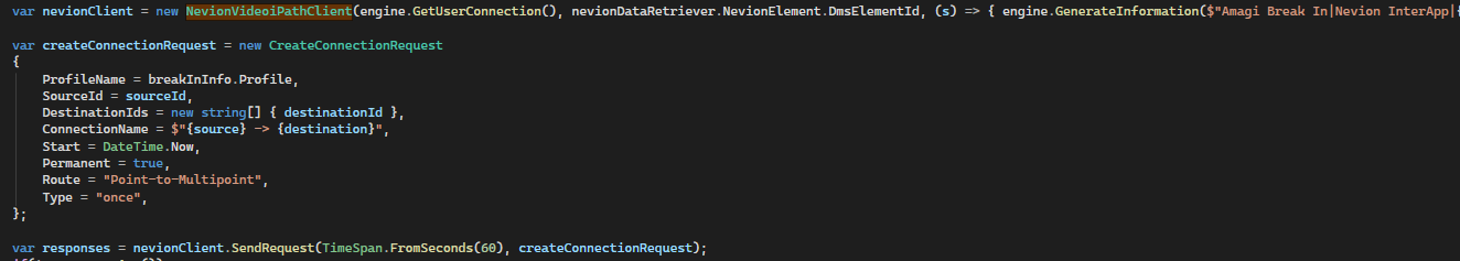 This is how the message is sent in the ConnectorAPI Nuget; I have also verified that this only runs once. In this case, the nevionElementId is the same as the remoteElementId. The NevionReceiverPid is 9000000 and receiverPid is 9000001