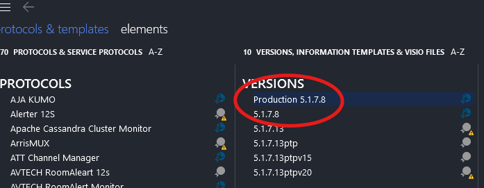 It would be helpful to be able to see what protocol has been selected as "Production" as seen in the DataMiner Cube "Protocols and Templates". The protocol version is appended to the Production name. Example: "Production 5.1.7.8"