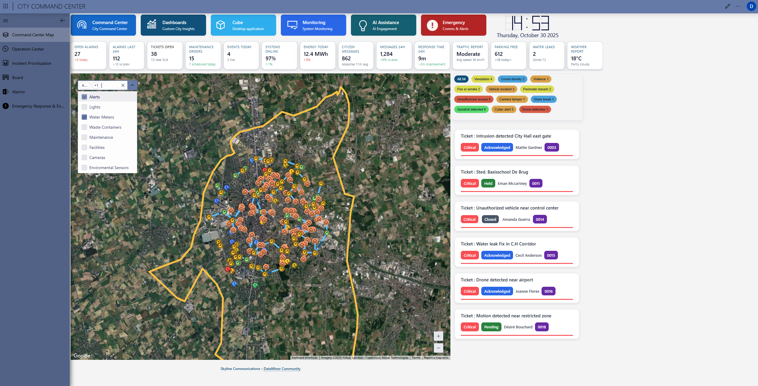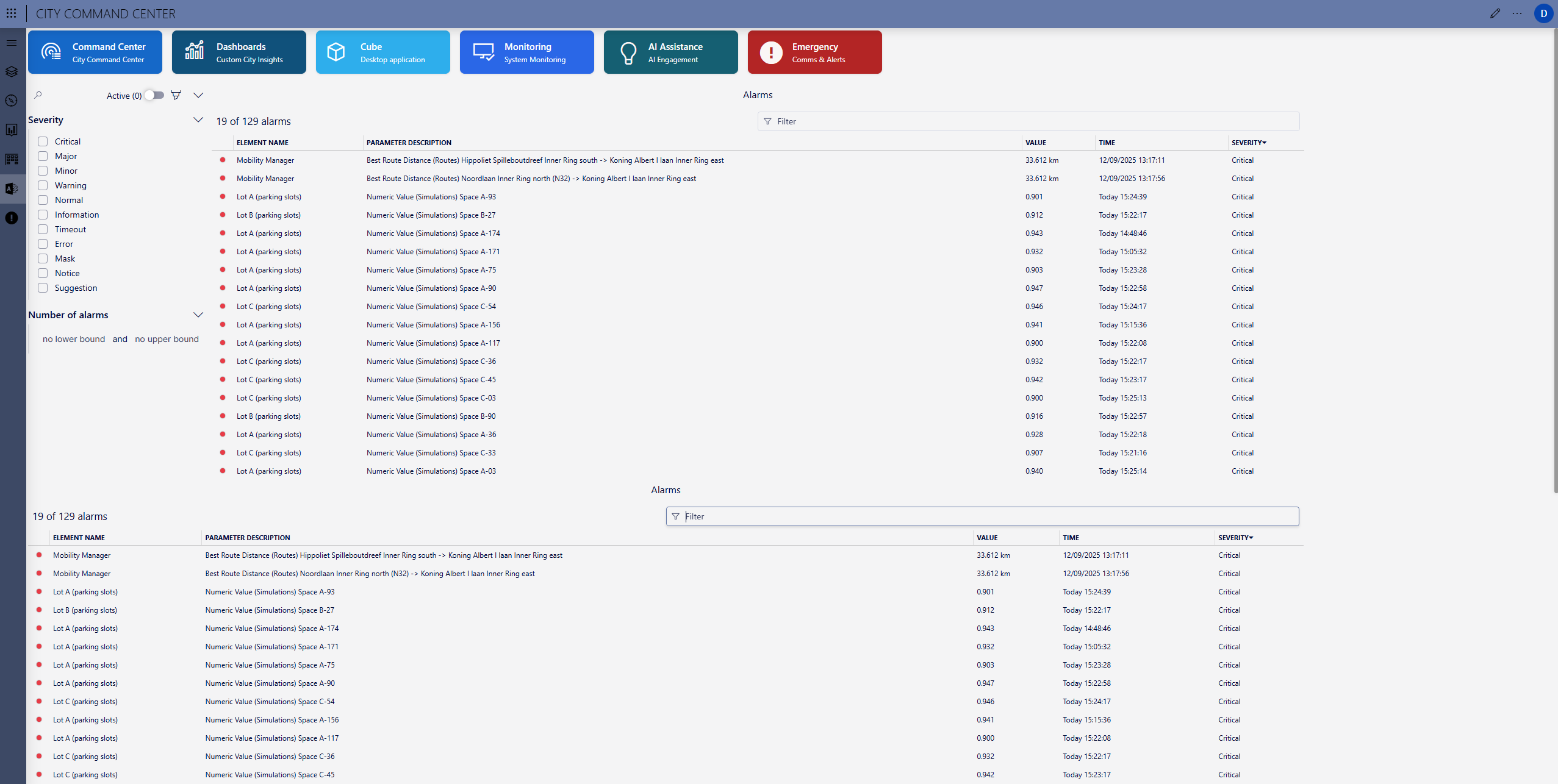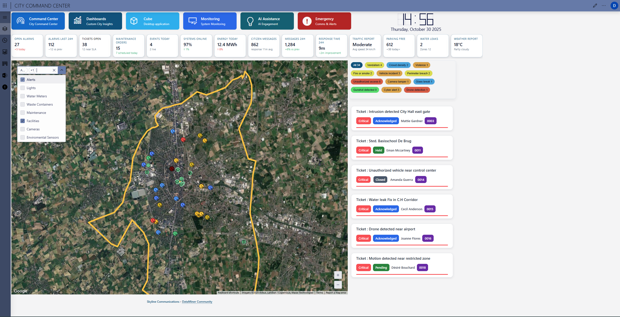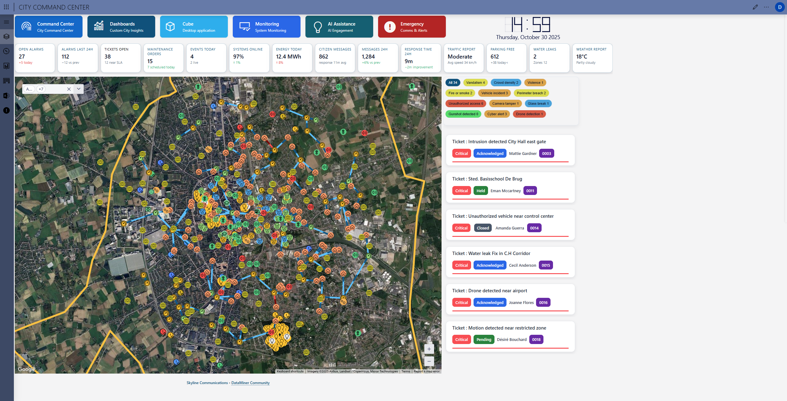 The DataMiner CityOps City Command Center is the core of a smart city’s operational environment, where all information, alerts, and activities come together in one unified workspace. It provides city operators with complete situational awareness through a live digital twin of the entire urban ecosystem, covering mobility, safety, energy, environment, and citizen services.