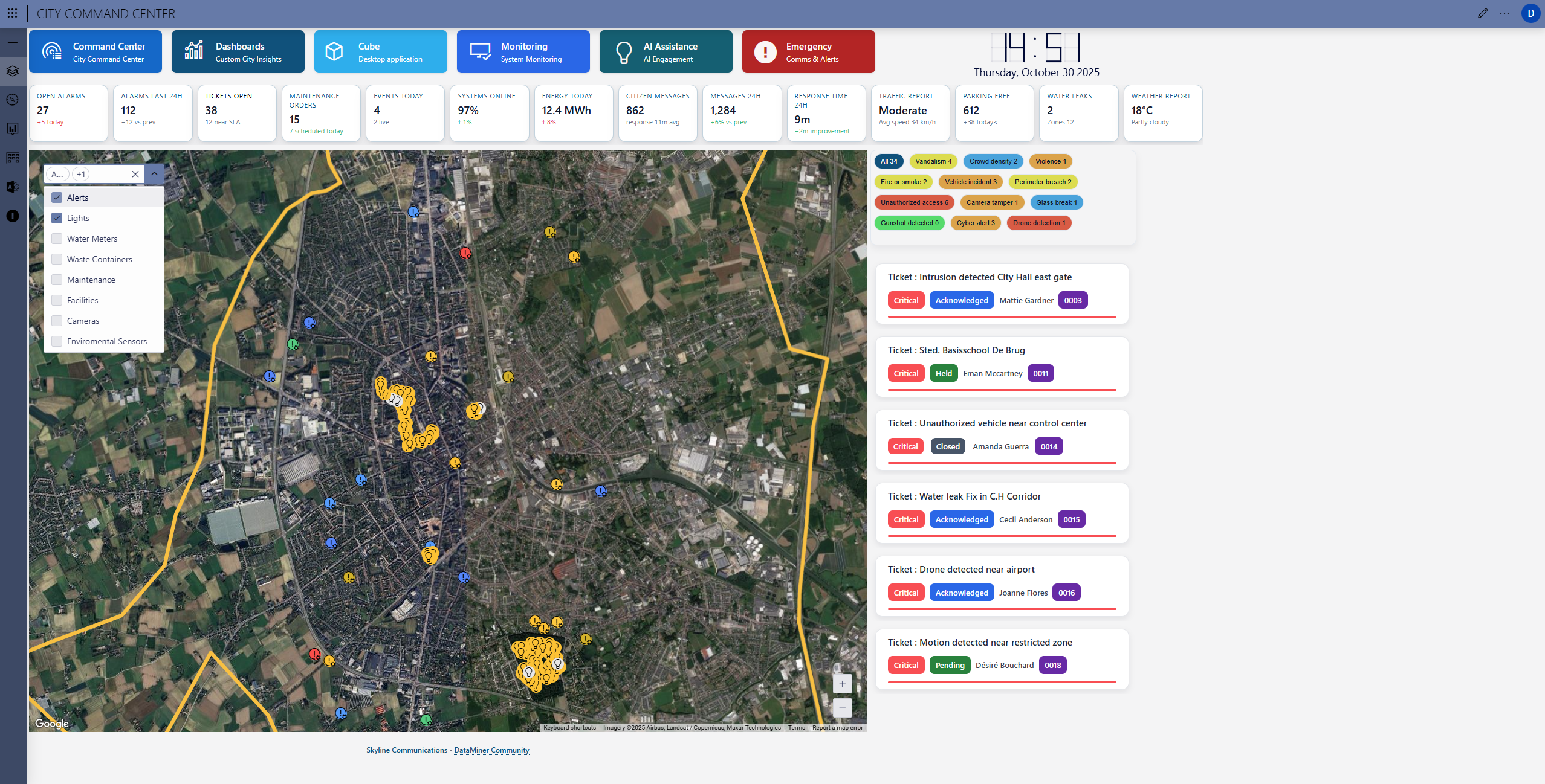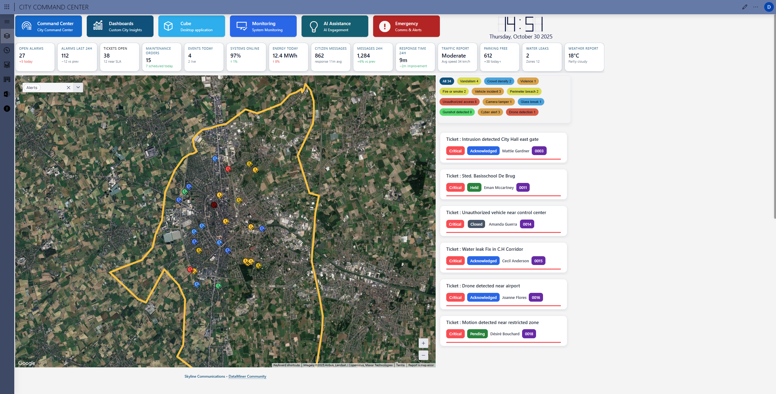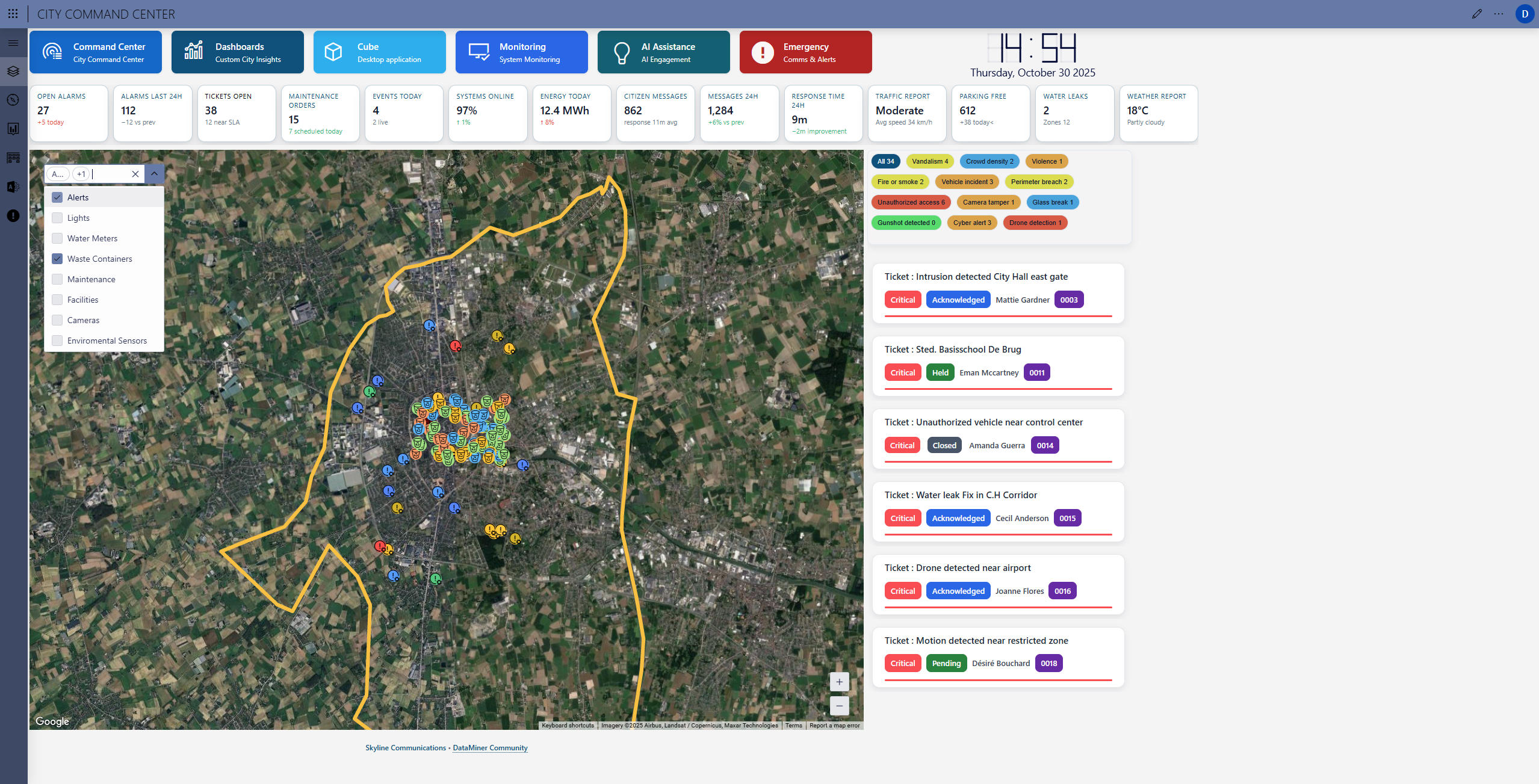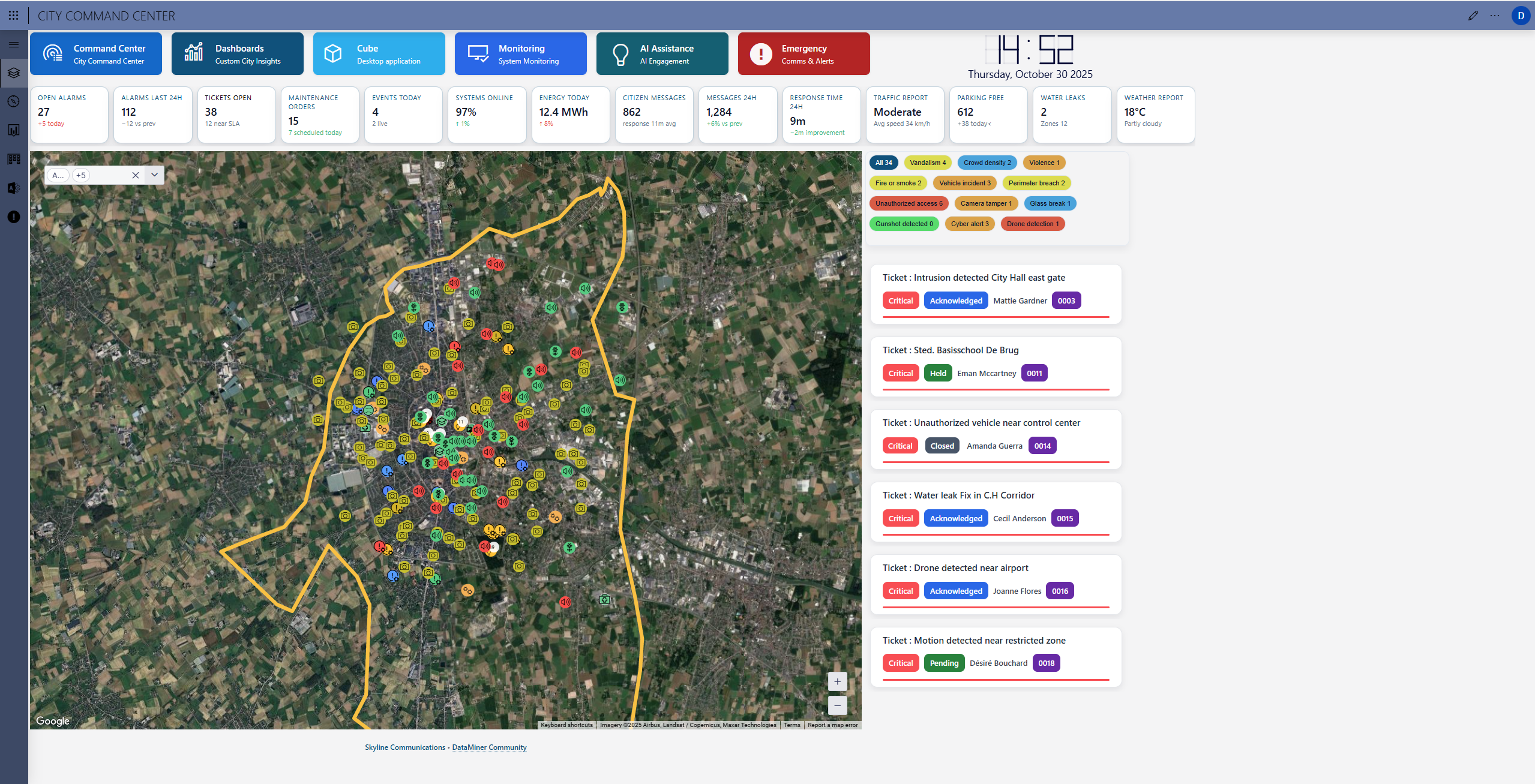 The DataMiner CityOps City Command Center is the core of a smart city’s operational environment, where all information, alerts, and activities come together in one unified workspace. It provides city operators with complete situational awareness through a live digital twin of the entire urban ecosystem, covering mobility, safety, energy, environment, and citizen services.