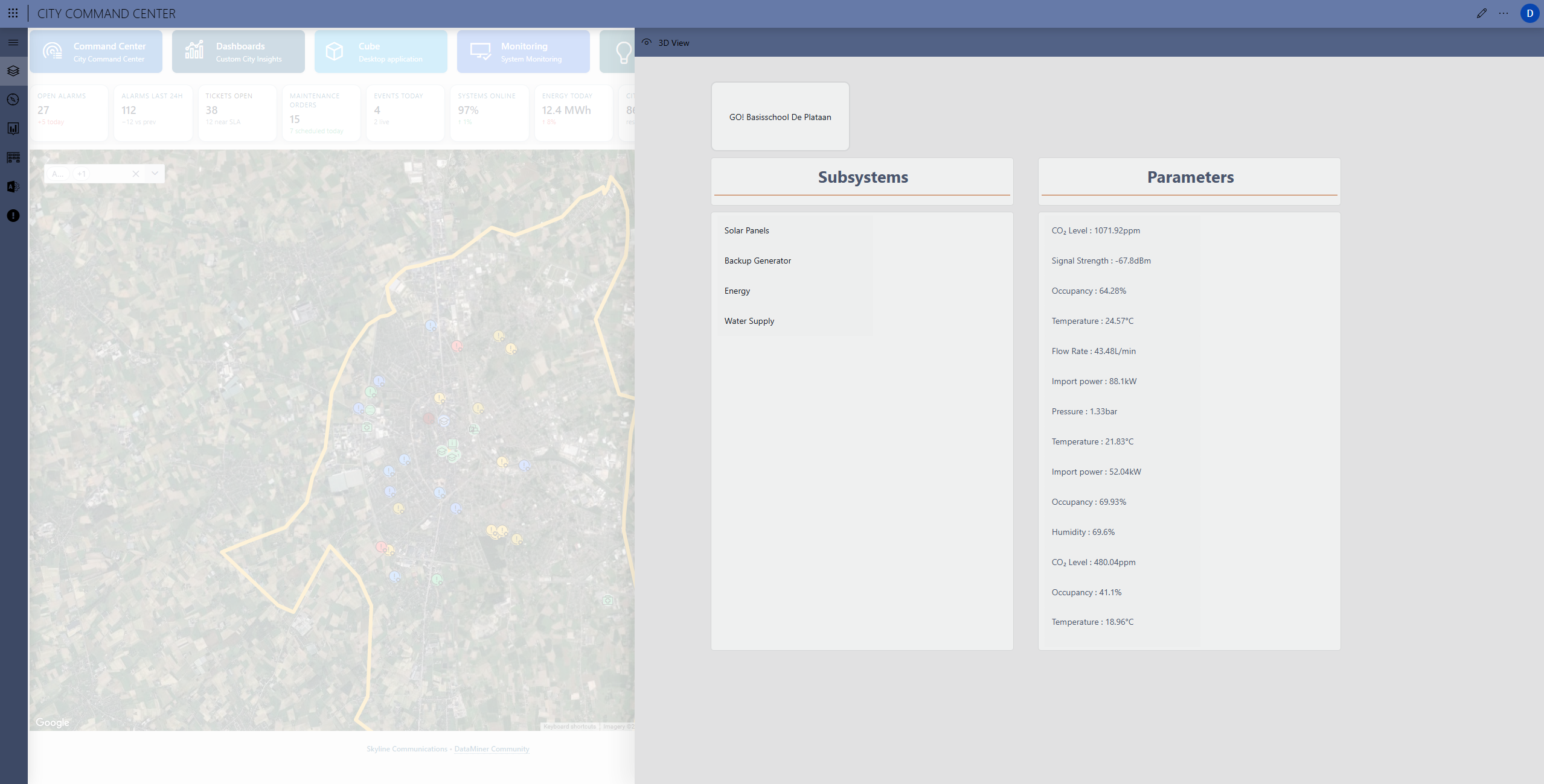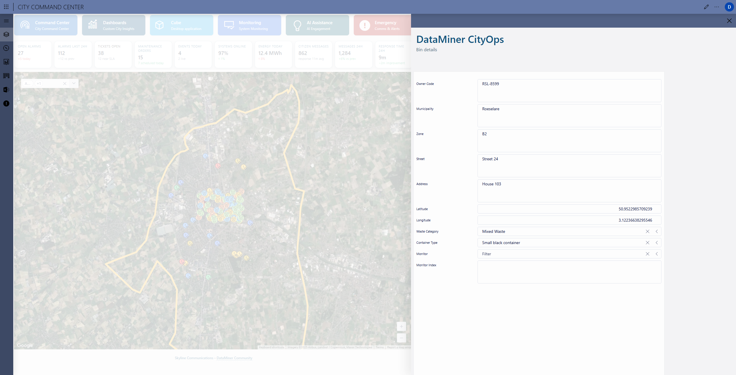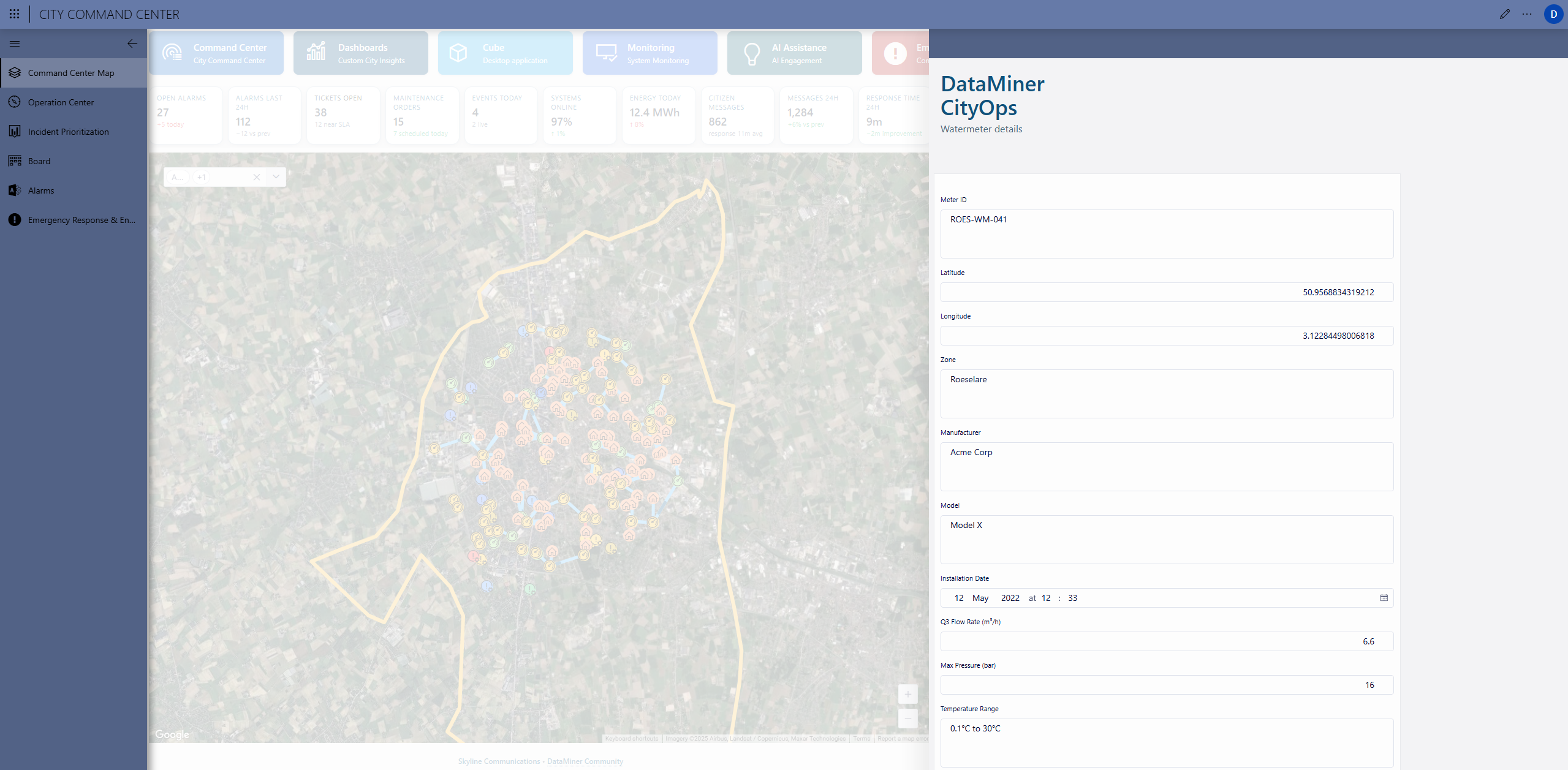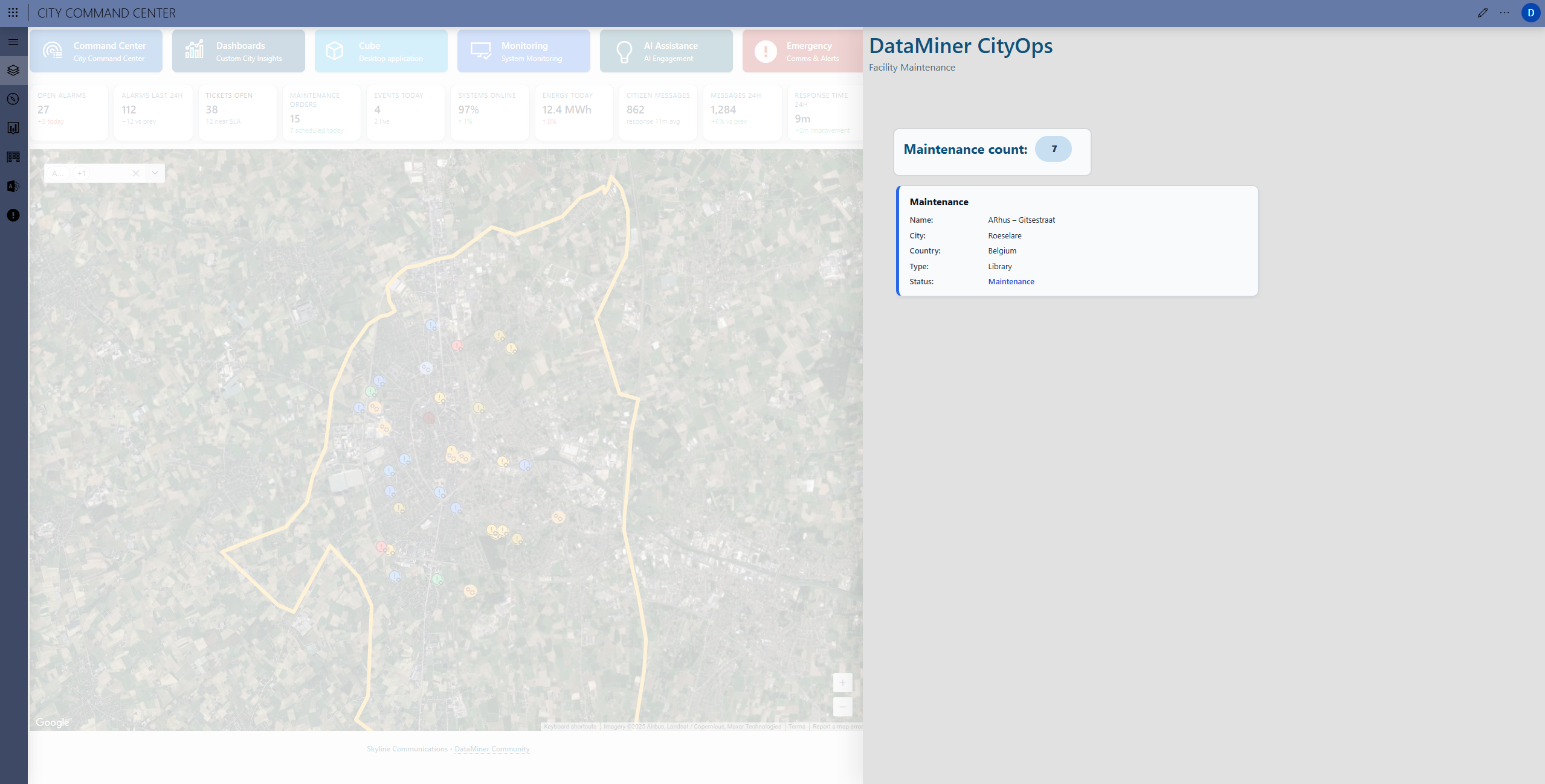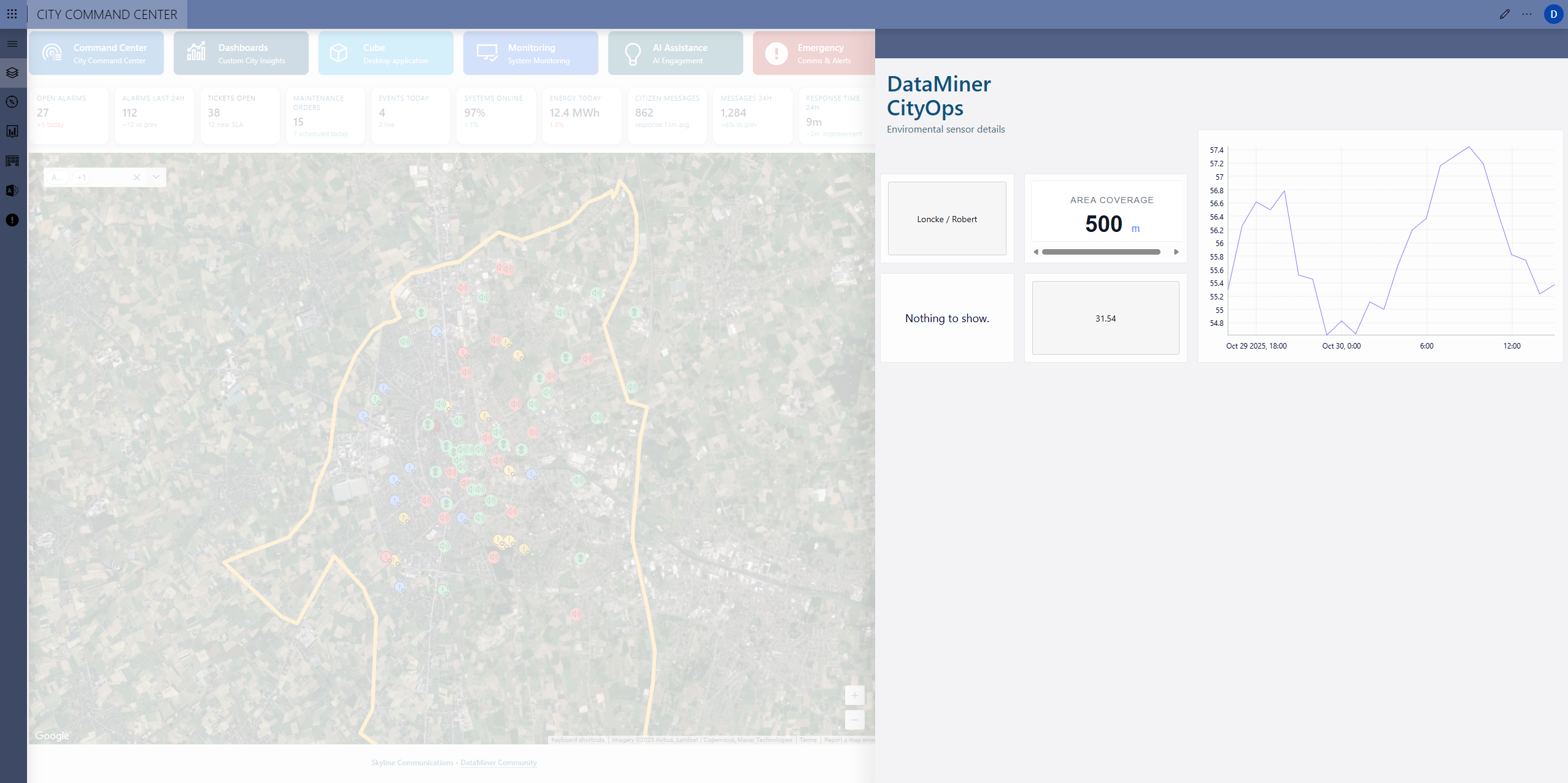 The Command Center map is the central visualization layer of the DataMiner CityOps Command Center, displaying all live city operations within a single, interactive view. Every sensor, system, and connected service is represented in real time, offering city operators a complete operational overview across all domains , from mobility and energy to safety, water, and waste.