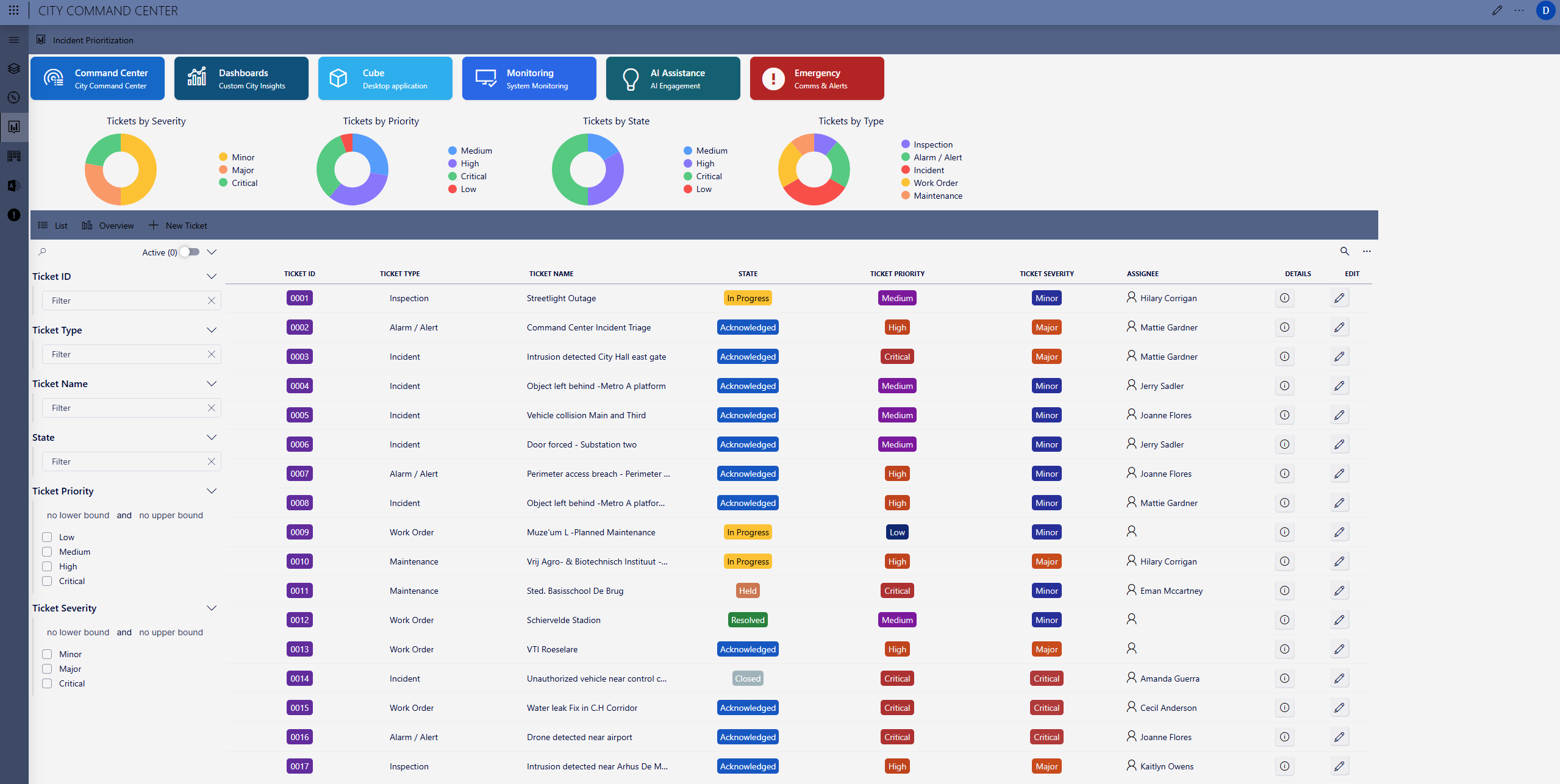 The Incident Prioritization page gives operators a clear and actionable overview of all ongoing and historical incidents across the city. It transforms complex operational data into an intuitive workspace where every alert, ticket, and work order is organized by severity, priority, and type.Visual dashboards at the top summarize the city’s live operational load, showing the number of tickets by severity, priority, and type. These charts provide an instant understanding of how many incidents are critical, which ones are approaching SLA deadlines, and how resources are currently distributed across maintenance, inspection, or emergency work.