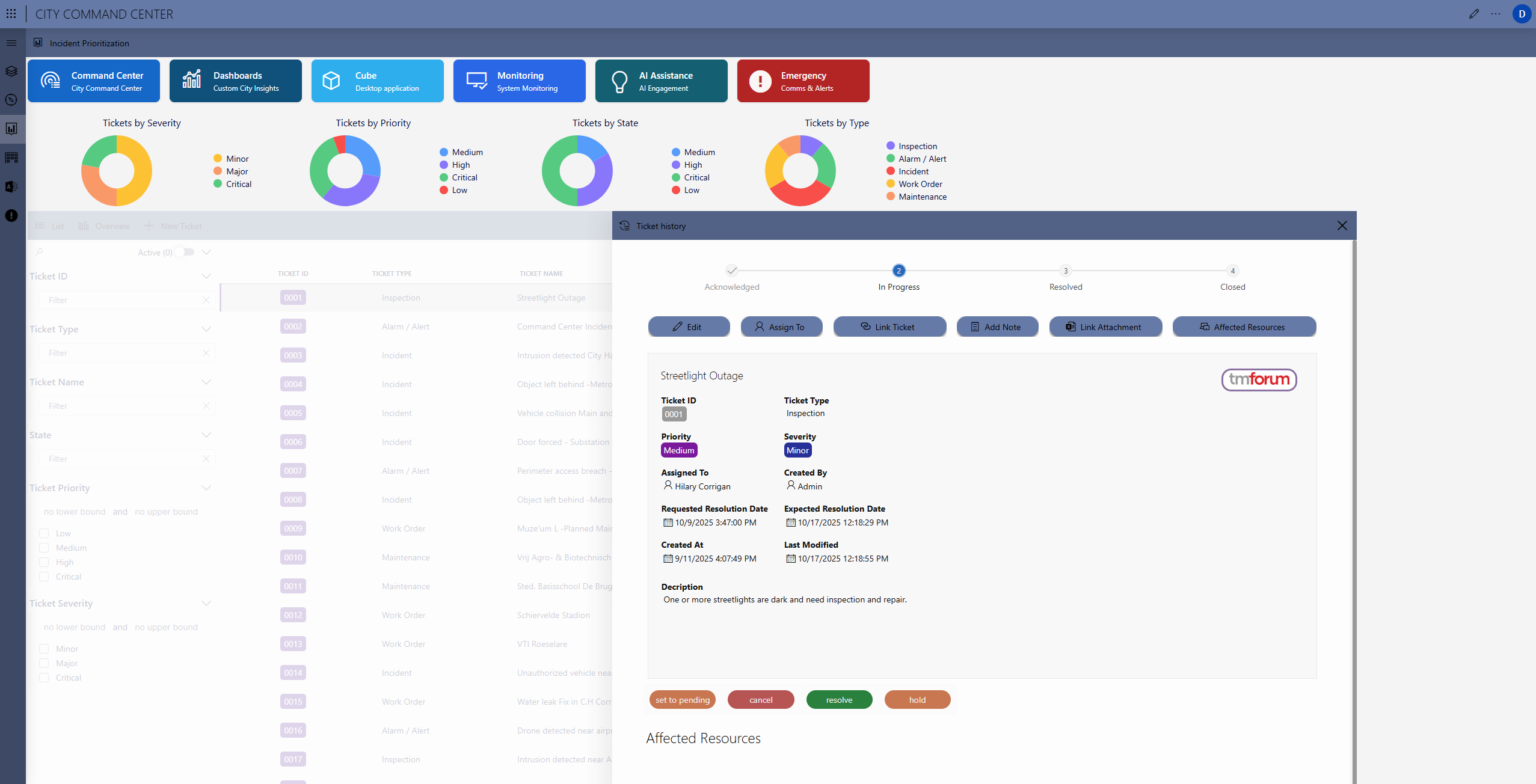 The Tickets and Work Orders board provides a centralized and transparent workspace for managing all ongoing activities across city operations. It brings together incidents, work orders, inspections, and maintenance tasks into one unified view, allowing every team to coordinate seamlessly from acknowledgment to resolution.The board organizes tasks visually by status (acknowledged, in progress, held or pending, and resolved), giving operators an instant overview of operational workload and task progression. Each card represents a live ticket, complete with priority, severity, assigned operator, and due dates. This layout makes it easy to track who is working on what and how each task contributes to restoring or maintaining service continuity.