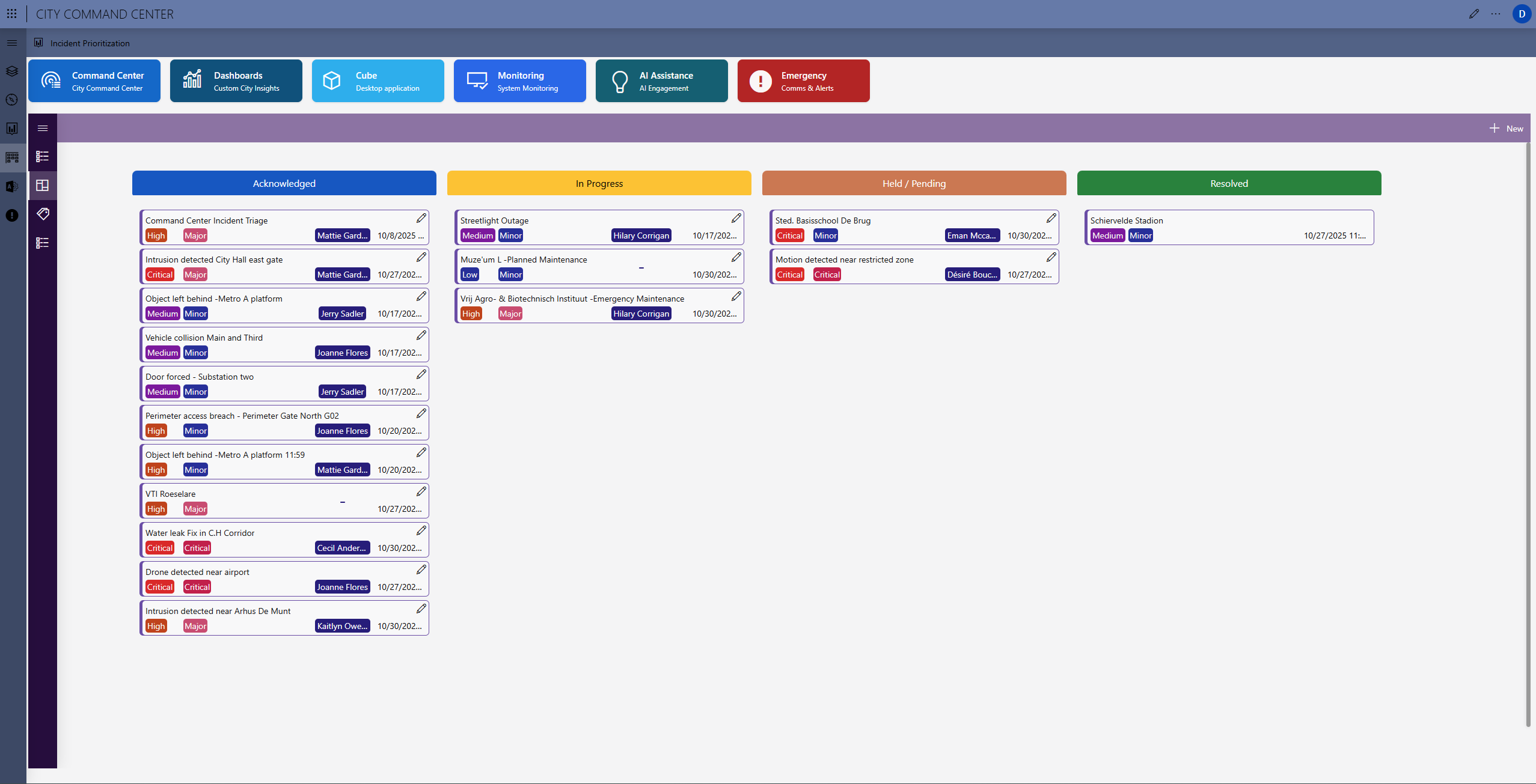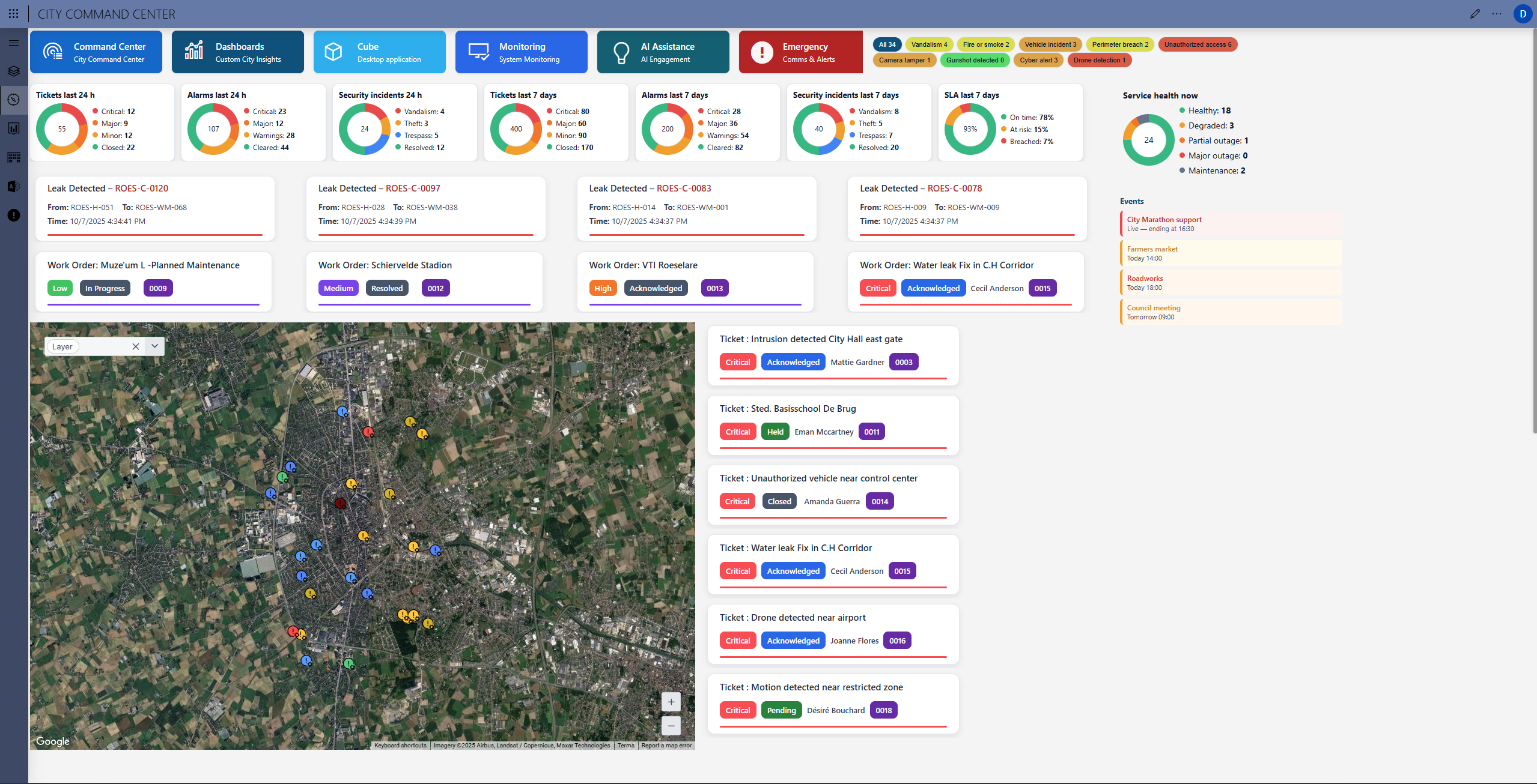 Every connected system continuously feeds data into the Command Center, where events are automatically correlated across domains. Incidents, alarms, maintenance tasks, and work orders are visualized in real time, creating a clear picture of what is happening across the city and how different elements interact.