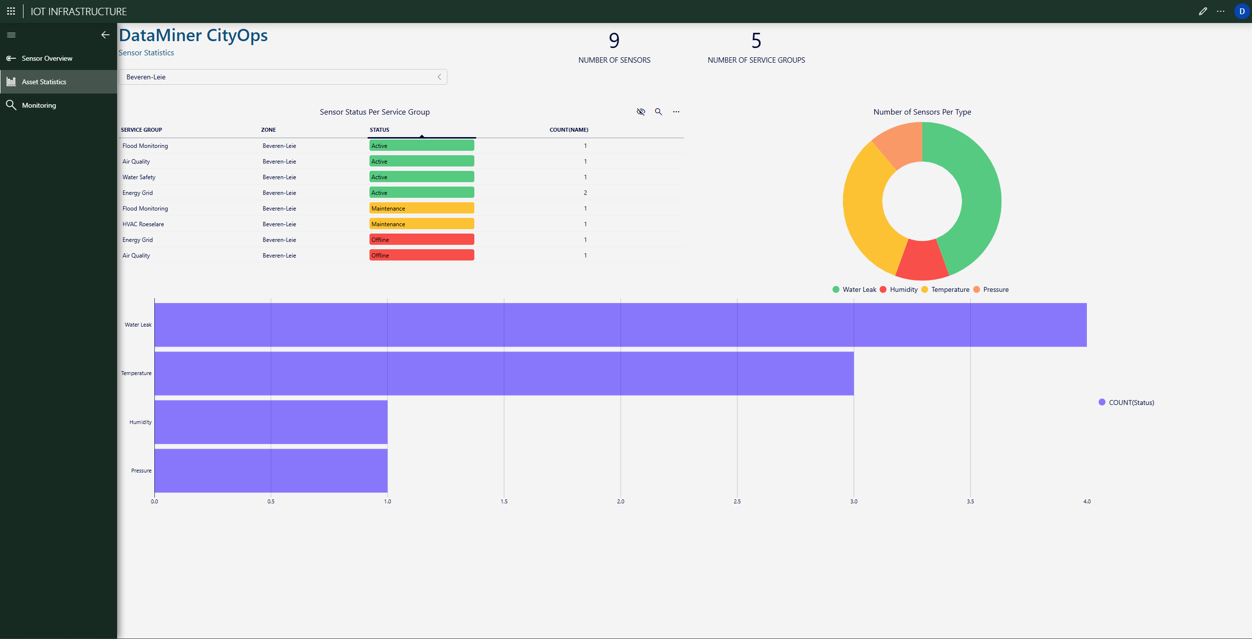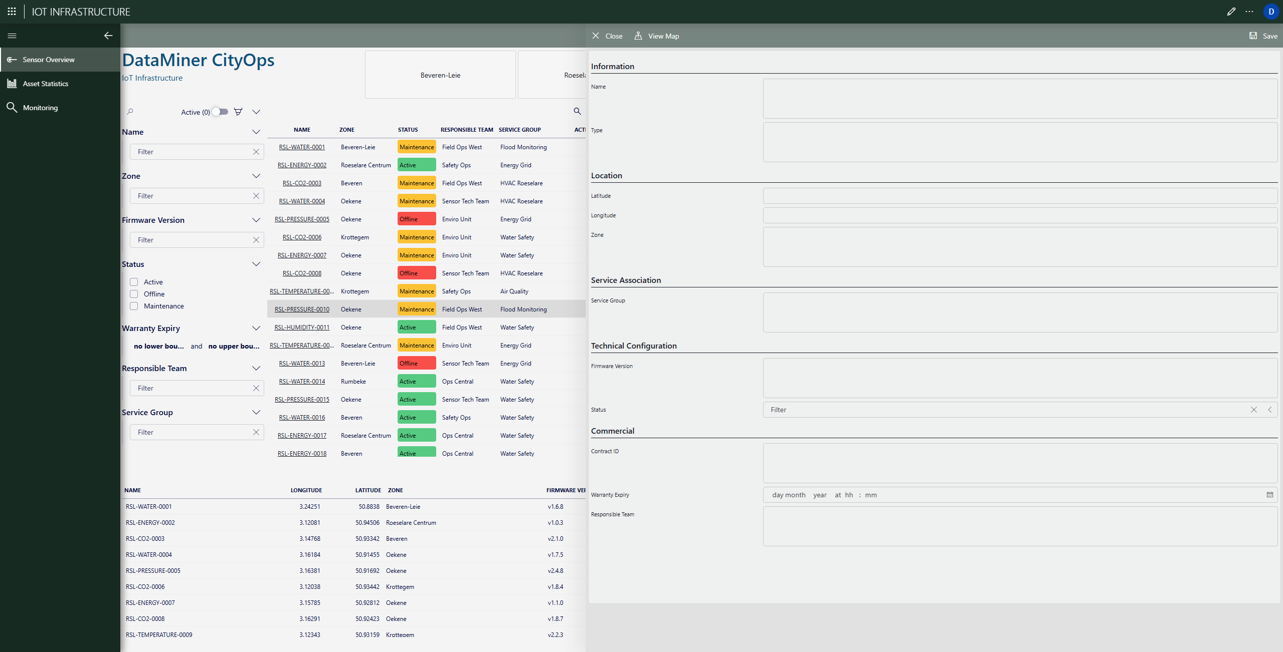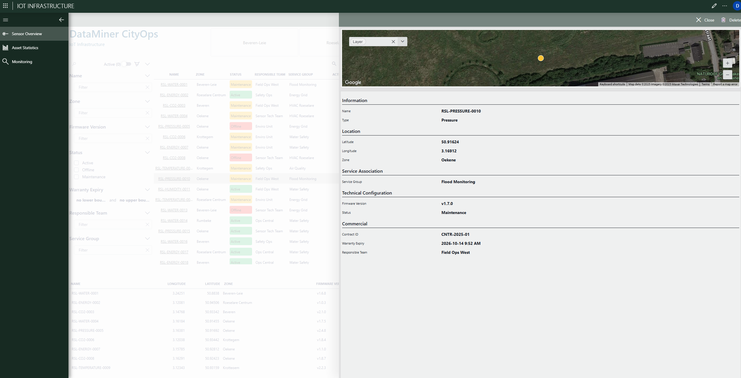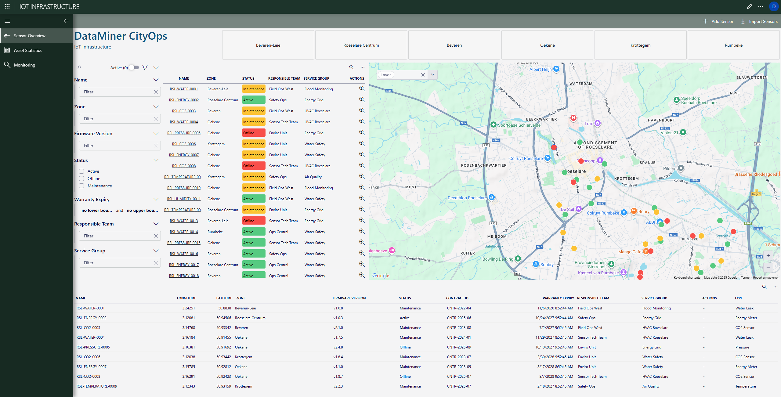 DataMiner CityOps IoT Infrastructure unifies the management of all connected devices within one intelligent environment. It automatically tracks operational status, last data transmission, communication quality, and firmware details to ensure continuous visibility of every device across the network.