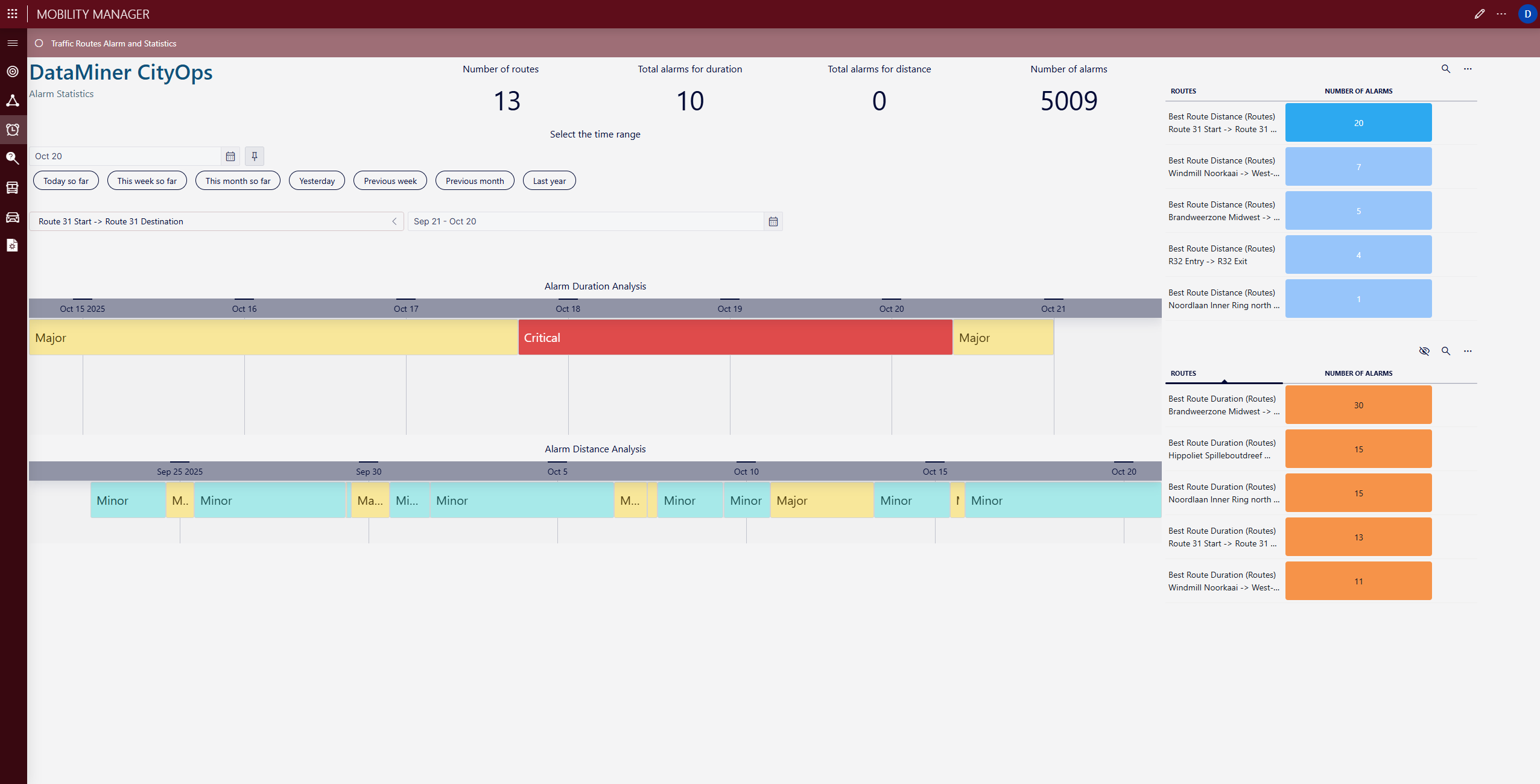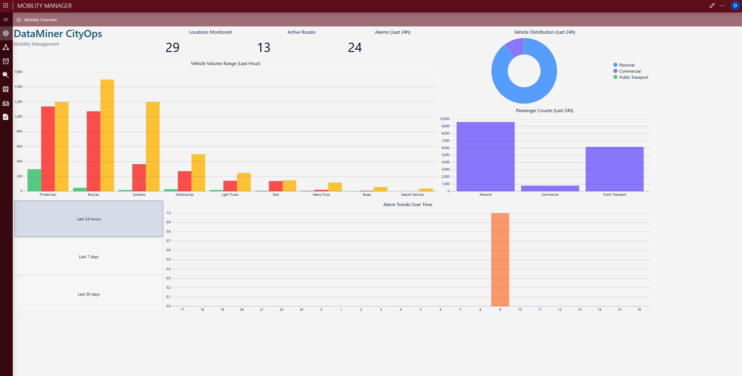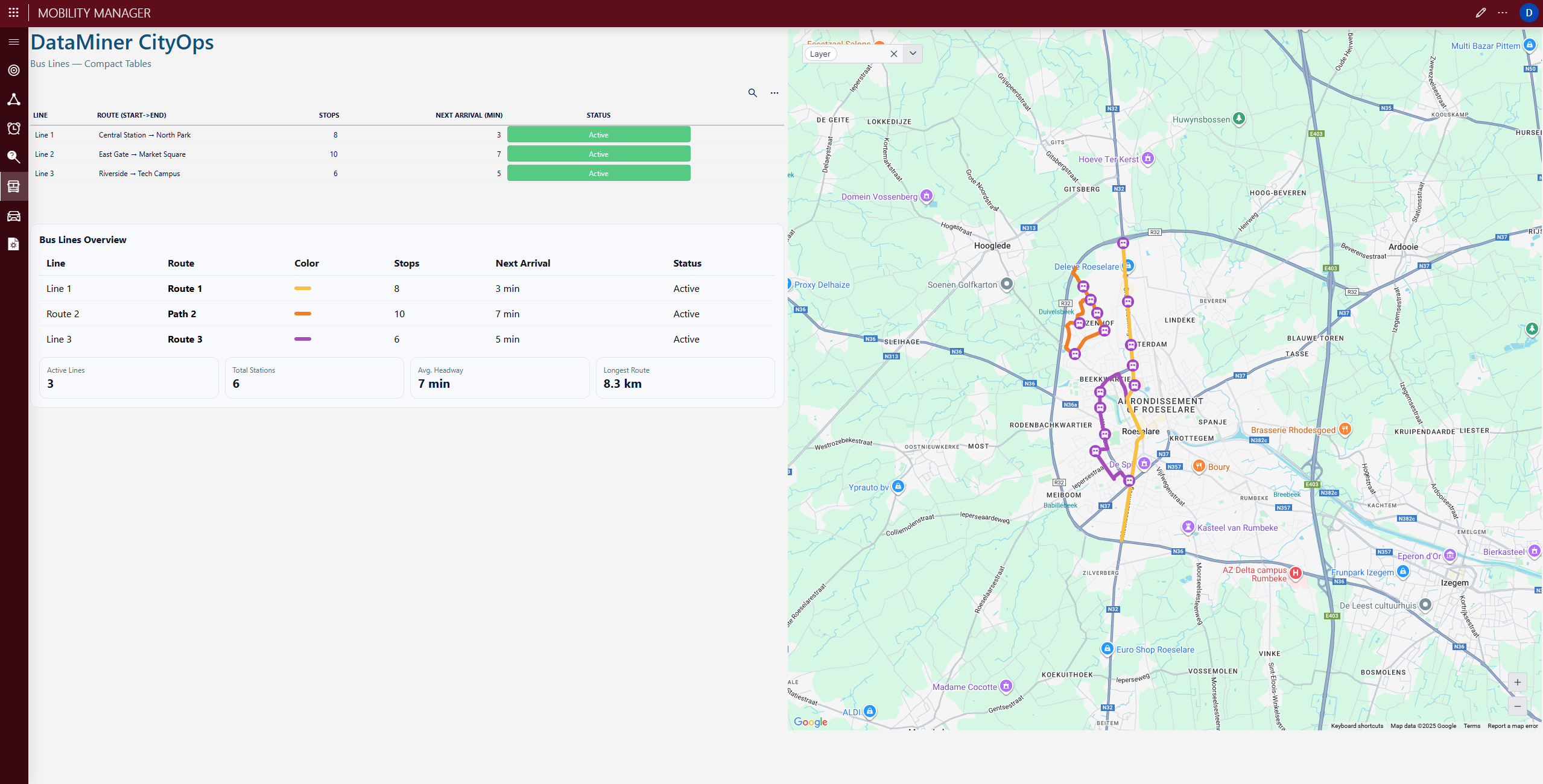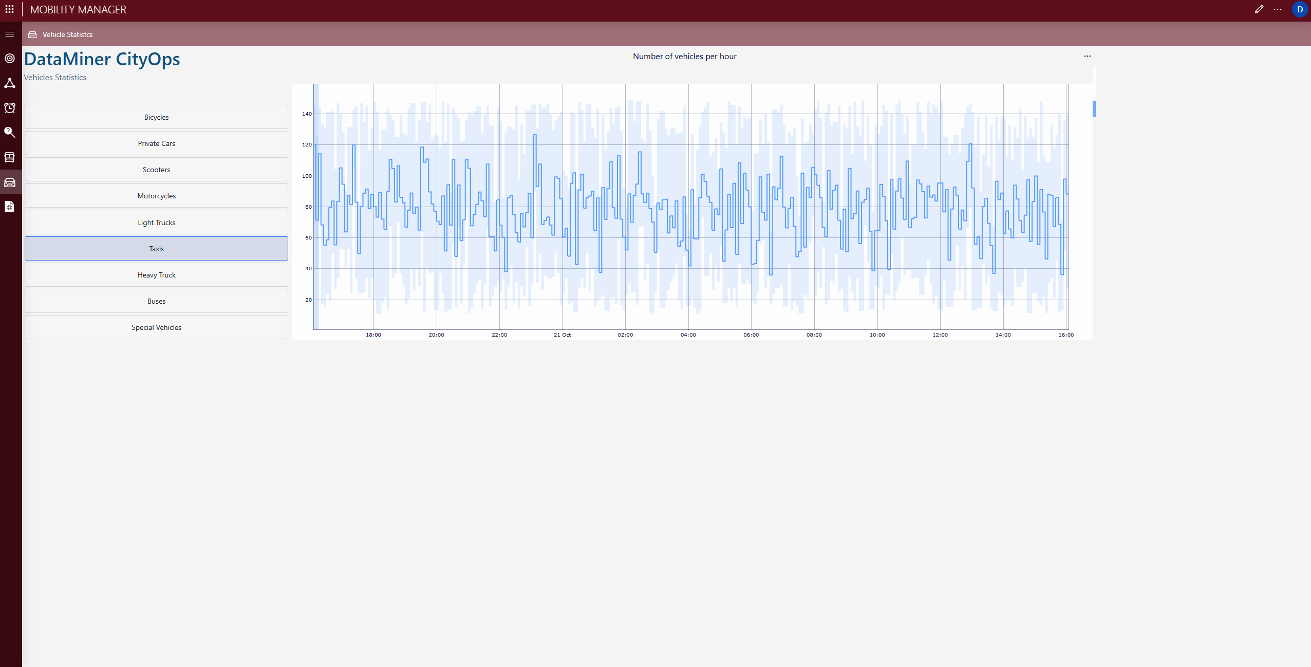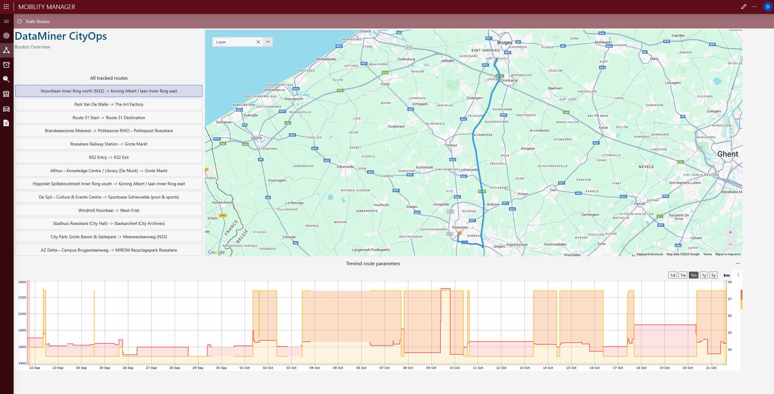 This use case demonstrates how DataMiner CityOps Mobility Manager integrates publicly available APIs to collect and visualize live route traffic conditions across the city. Traffic data is continuously gathered, analyzed, and trended over time to provide accurate statistics and predict congestion. Integrated smart cameras at major traffic points enhance these insights by automatically identifying and classifying vehicles, enabling advanced recognition and predictive analytics based on vehicle type and flow. This approach delivers actionable mobility intelligence, allowing cities to plan and optimize infrastructure investments without immediately deploying a full-scale smart traffic camera network.