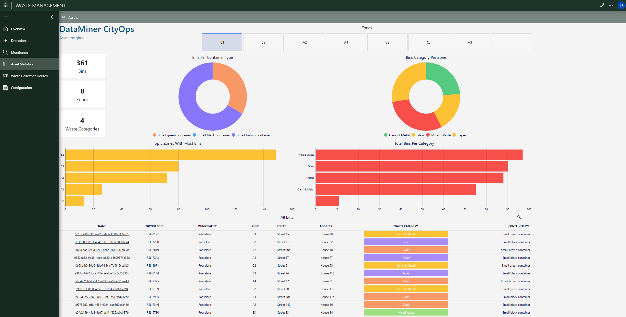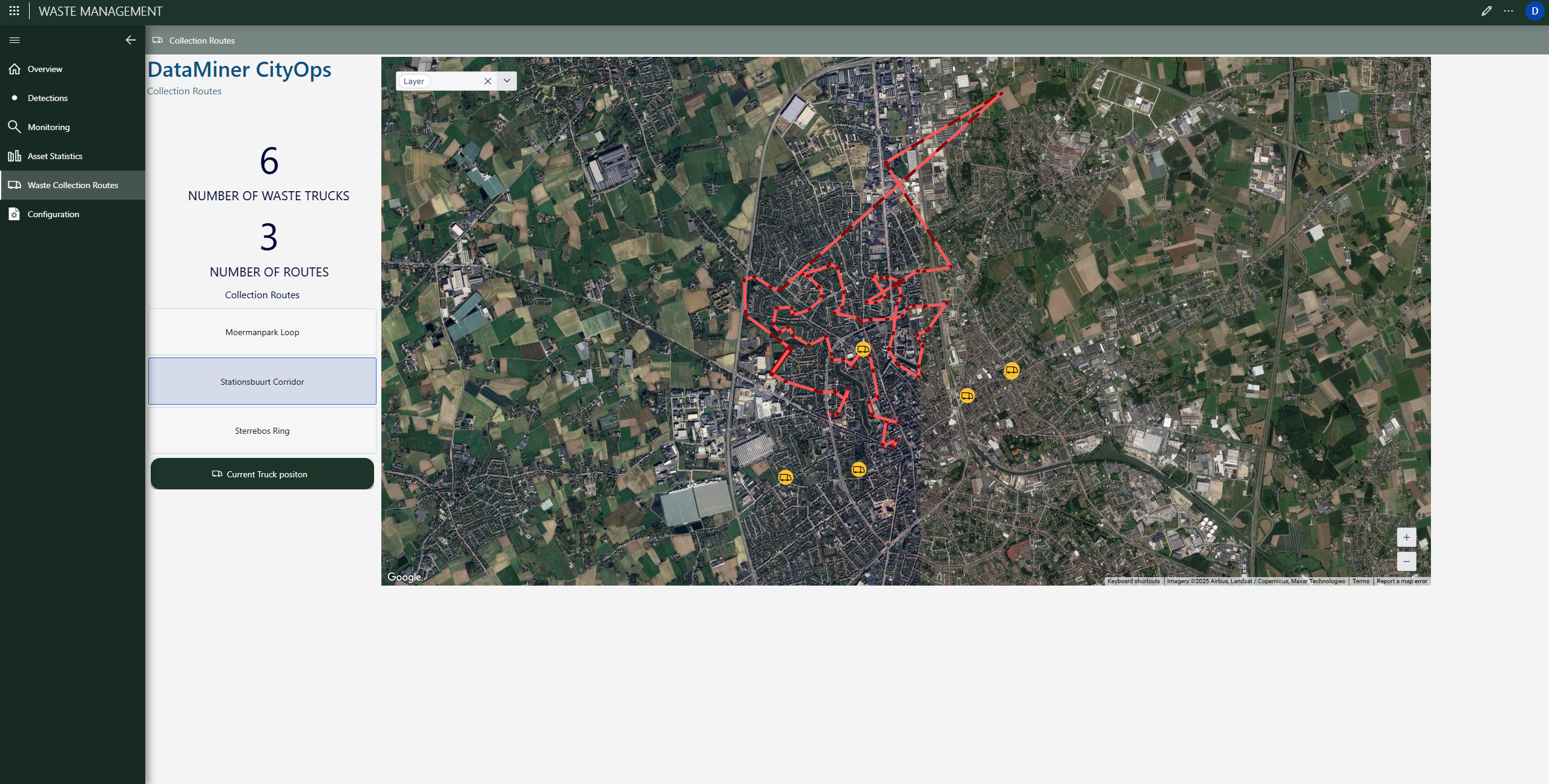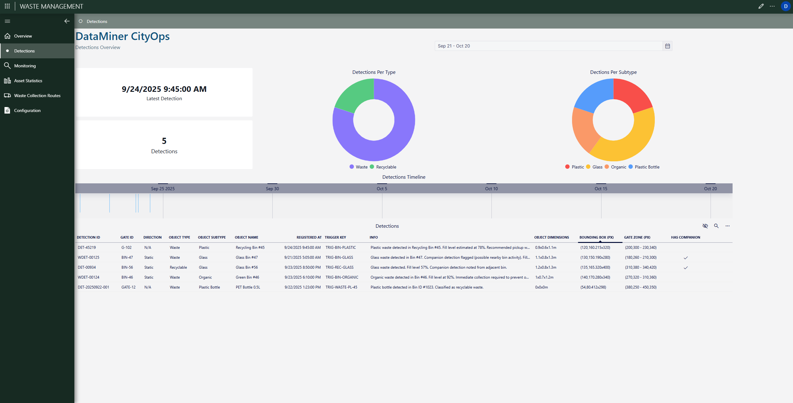 The DataMiner CityOps Waste Management module enables cities to run efficient and sustainable waste operations across all zones, integrating asset intelligence, route optimization, and live sensor data. Working in sync with CityOps Asset Management, Planned Maintenance, and Work Orders, it gives municipalities full visibility from container status to collection fleet movement, transforming detections into data-driven actions.
