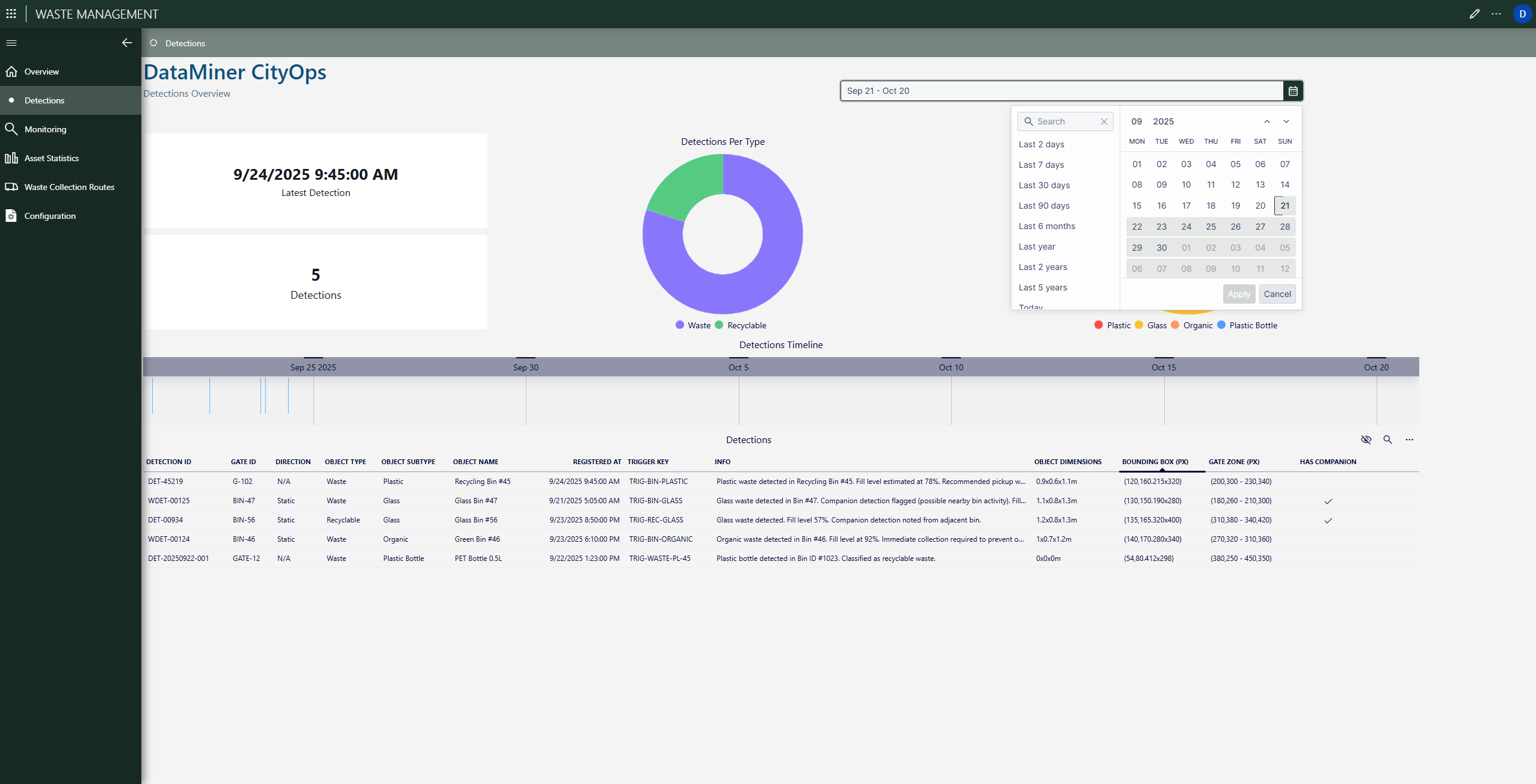 This calendar overlay lets users filter detections by custom time periods such as the last 7 days, last month, or any chosen range. Analysts use this to correlate waste events with weather, public holidays, or seasonal patterns, enhancing planning accuracy.