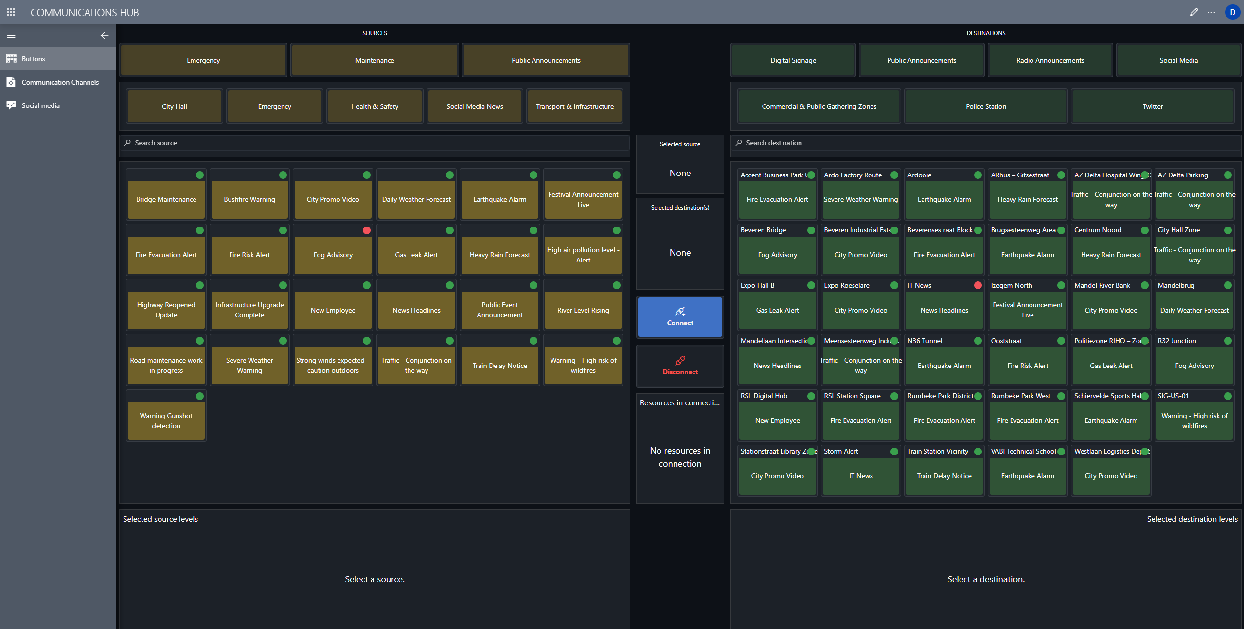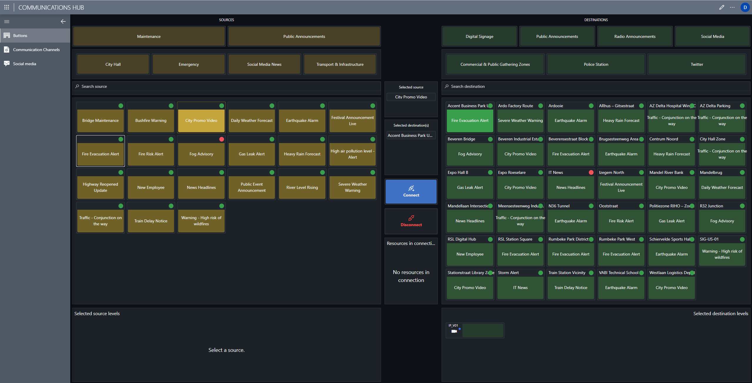 This view enables operators to manage live connections between message sources and destinations. Alerts, maintenance updates, or weather warnings can be dynamically linked to digital signage, public announcement, radio, or public display systems. Every source and destination is verified for operational status with health indicators, ensuring resilience and fault-free communication during critical situations.