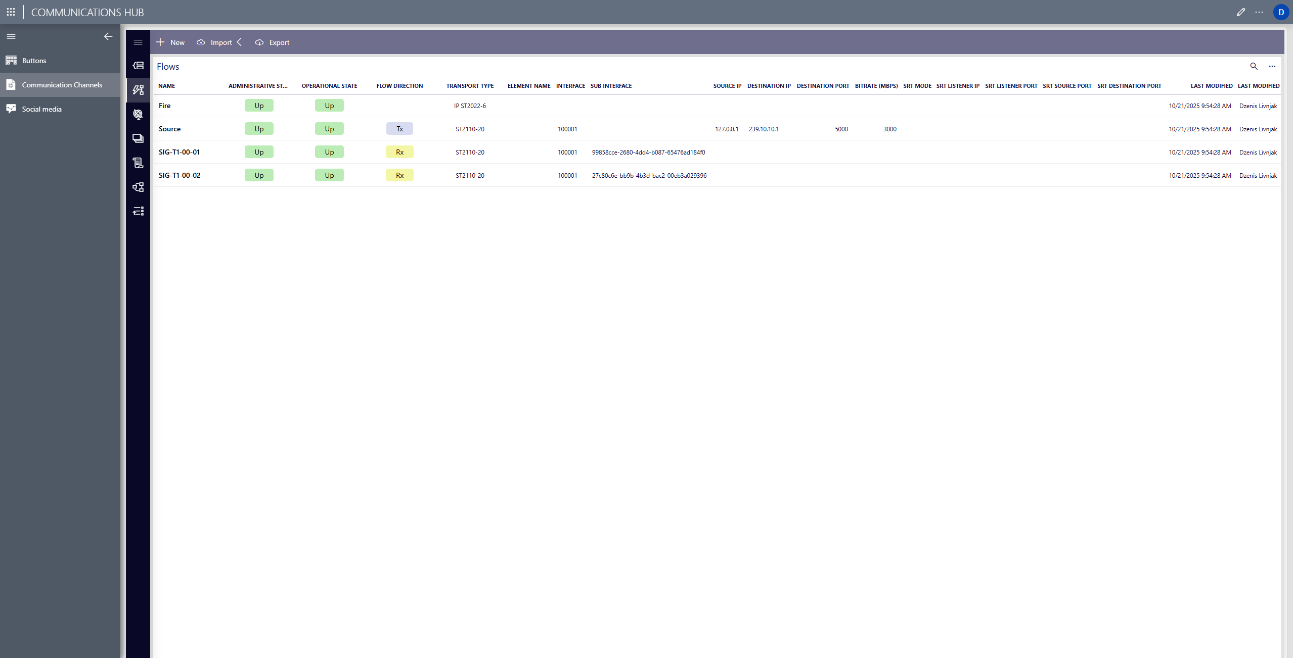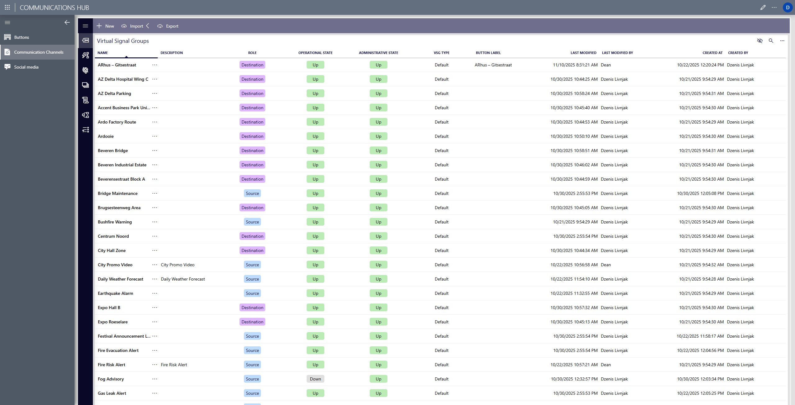 Each signal group represents an information flow between departments, city assets, or external communication platforms. Operators can define whether a source acts as an origin or destination, view its administrative and operational state, and track modification history. This ensures that every communication pathway is transparent, controlled, and fully auditable.