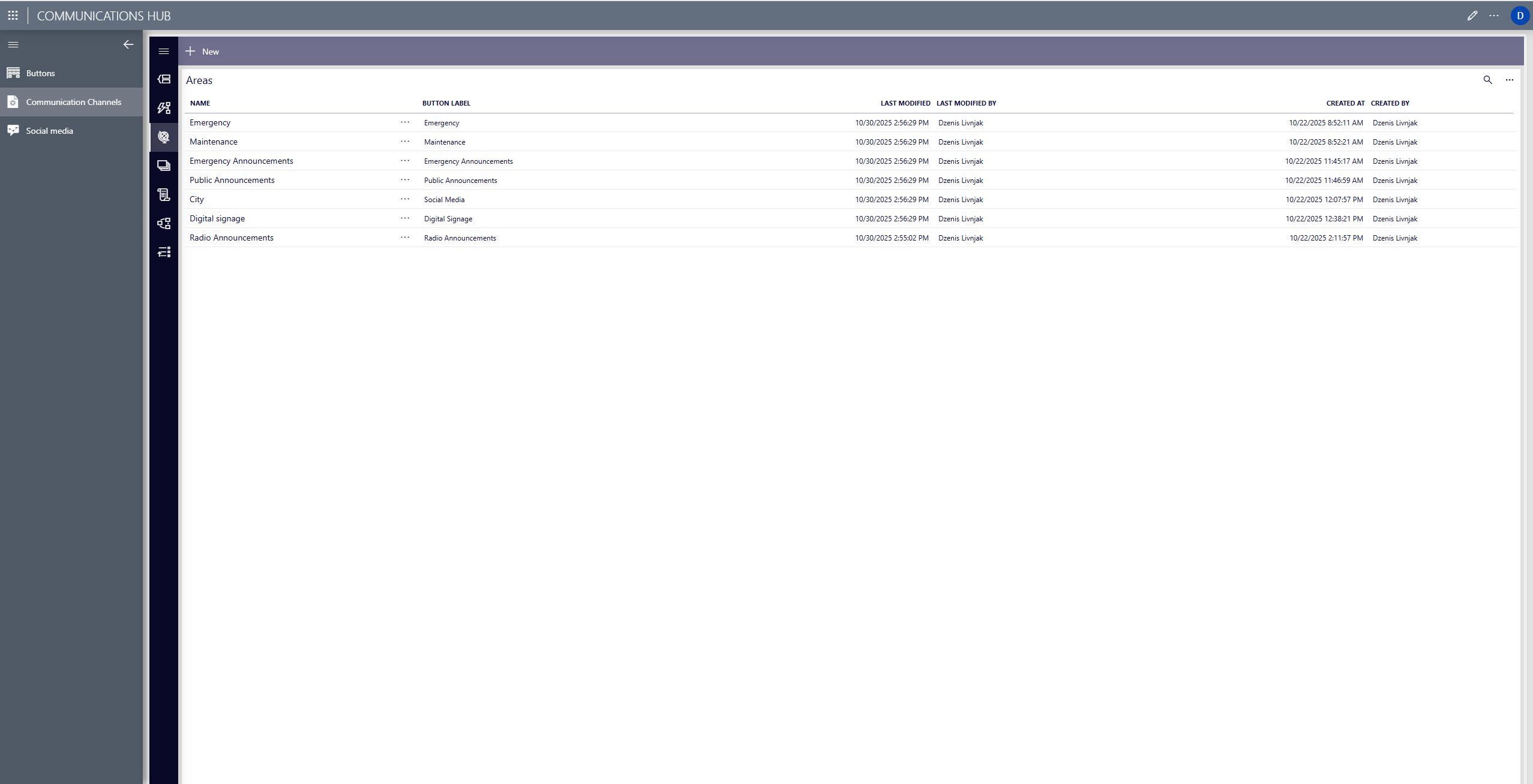 Areas group communication channels based on operational context such as emergency response, maintenance, or public announcements. Each area can be independently configured to manage domain-specific communications, ensuring that every message reaches the relevant stakeholders and audiences efficiently.