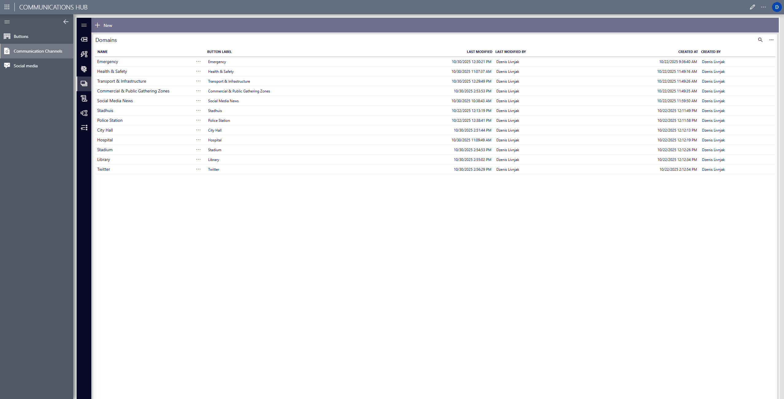 Domains define the thematic or organizational scope of communication, including Health & Safety, Transport & Infrastructure, Social Media News, and Public Gathering Zones. Each domain integrates various communication endpoints, enabling citywide coordination while maintaining operational integrity and data consistency.