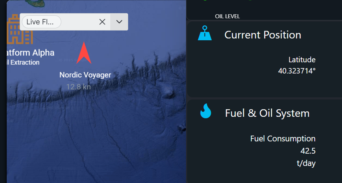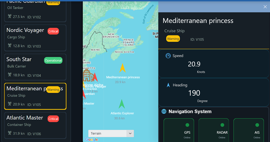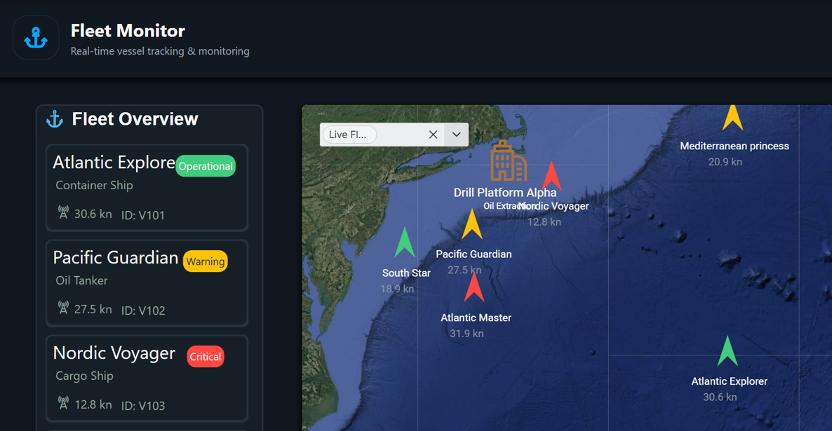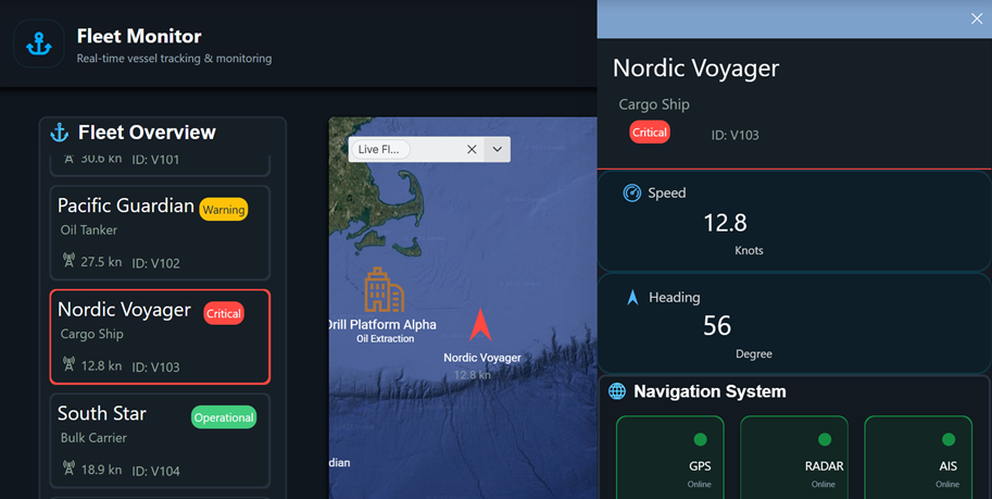 The Fleet Overview provides a complete snapshot of all vessels, including:• Real-time vessel positions using latitude and longitude