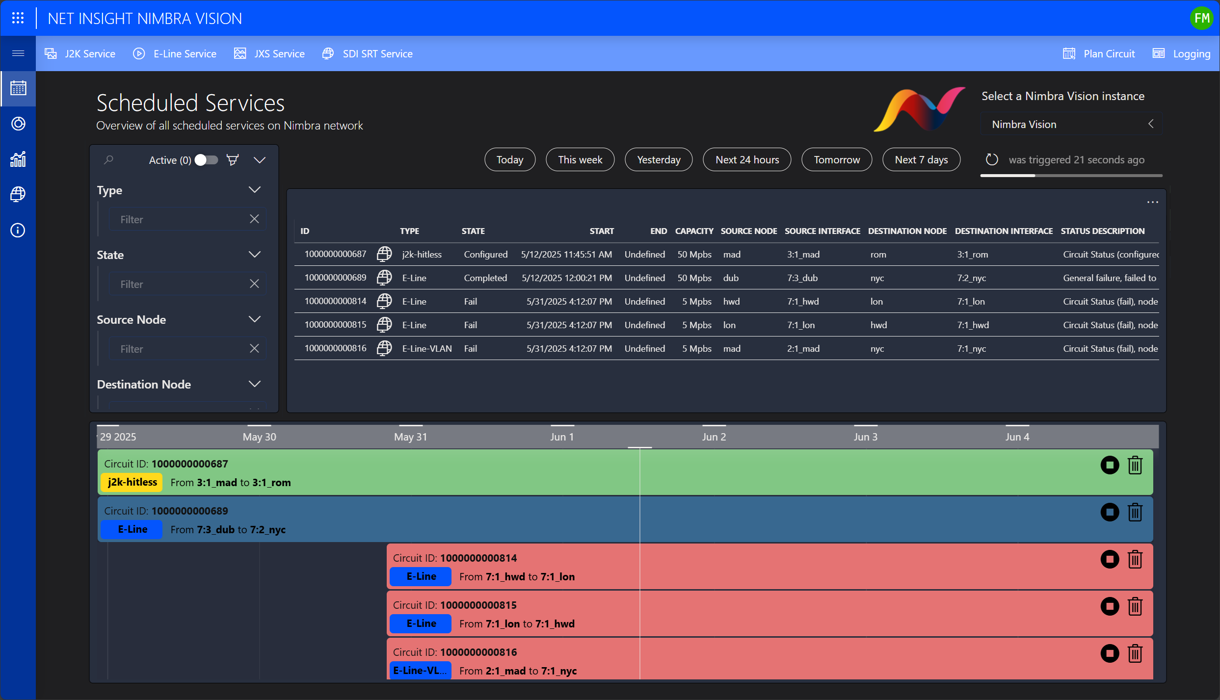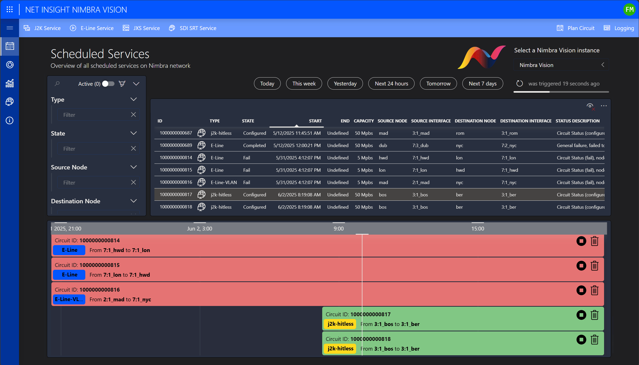 Gain complete visibility into all active and future Nimbra MSR circuits with intuitive filtering options, whether by service type (e.g. J2K, J2K Hitless, E-Line), or by source and destination nodes. Setting up a new ad hoc circuit is remarkably simple: select the service type, use the DataMiner XY routing panel to choose your source and destination nodes, and assign the appropriate interfaces to configure a service with a predefined bitrate.However, real-time setup can run into limitations, such as insufficient bandwidth or unavailable resources. With DataMiner, you can also schedule your events in advance, ensuring that all required connections are established at the right time and in the correct format.