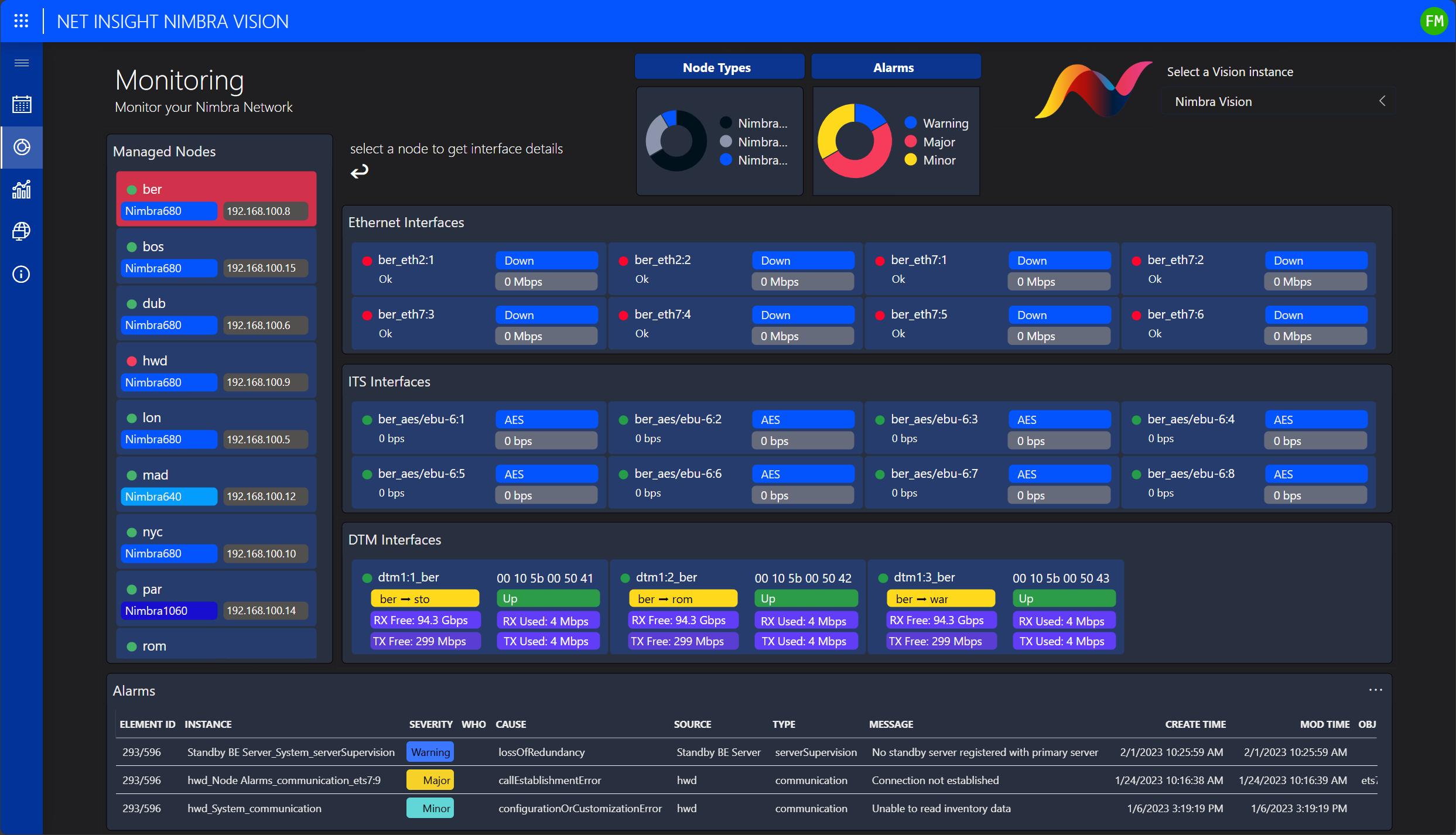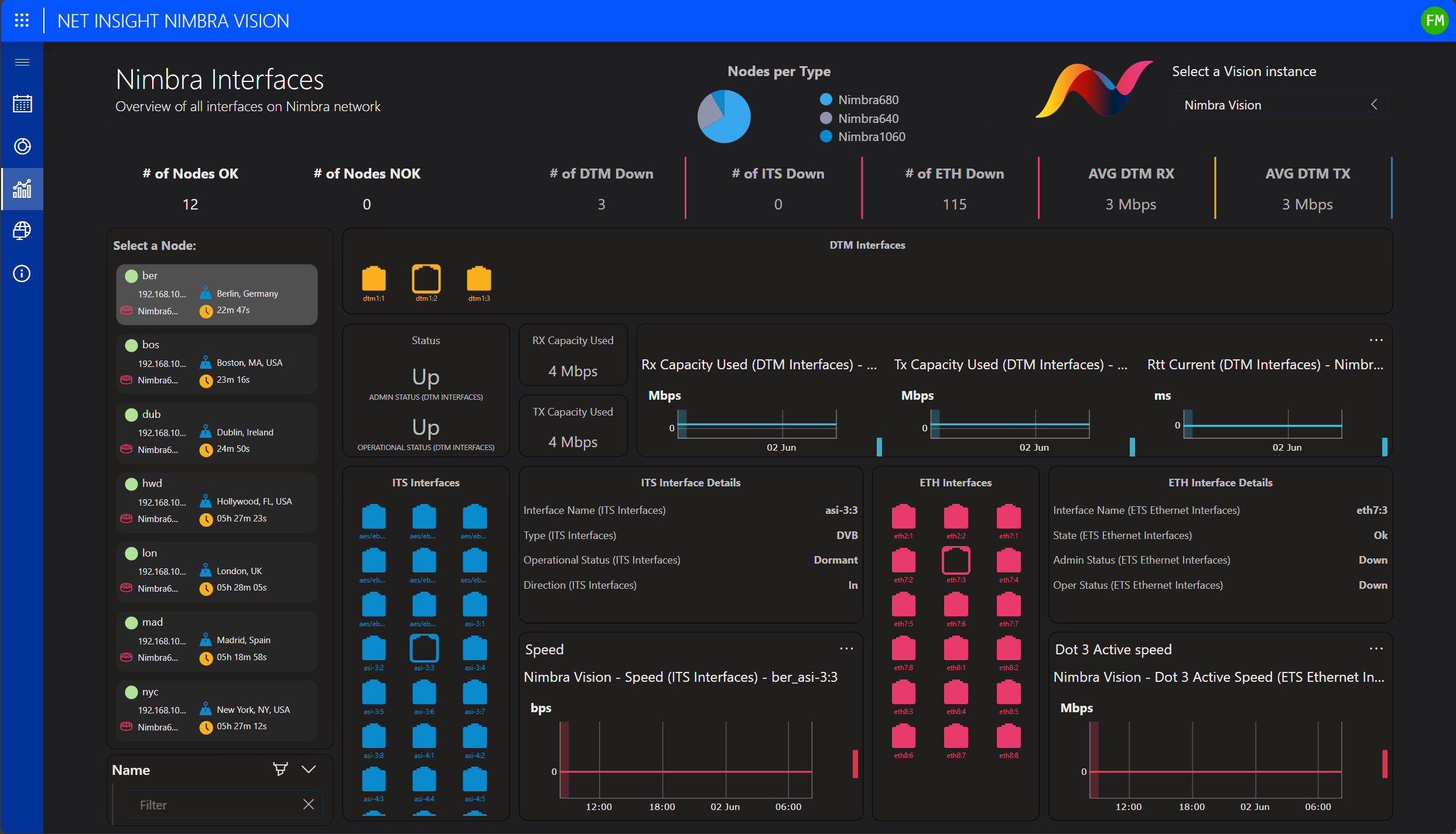 You also get an overview of all Nimbra nodes orchestrated by Nimbra Vision, which allows you to easily monitor both the overall node status and individual interfaces. Real-time insights into RX and TX capacity provide a detailed understanding of the resource usage.