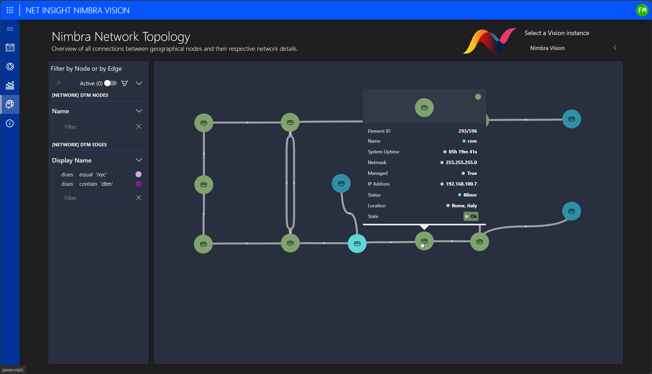 DataMiner integrates with Nimbra Vision’s RESTful API, allowing it to retrieve and visualize the full network topology. You can customize the interface by color-coding nodes and trunks for clarity, and simply hover over any element to access real-time metrics, such as link status, capacity utilization, and overall health indicators for each node and trunk. This intuitive visualization empowers teams with instant insights into network performance and reliability.