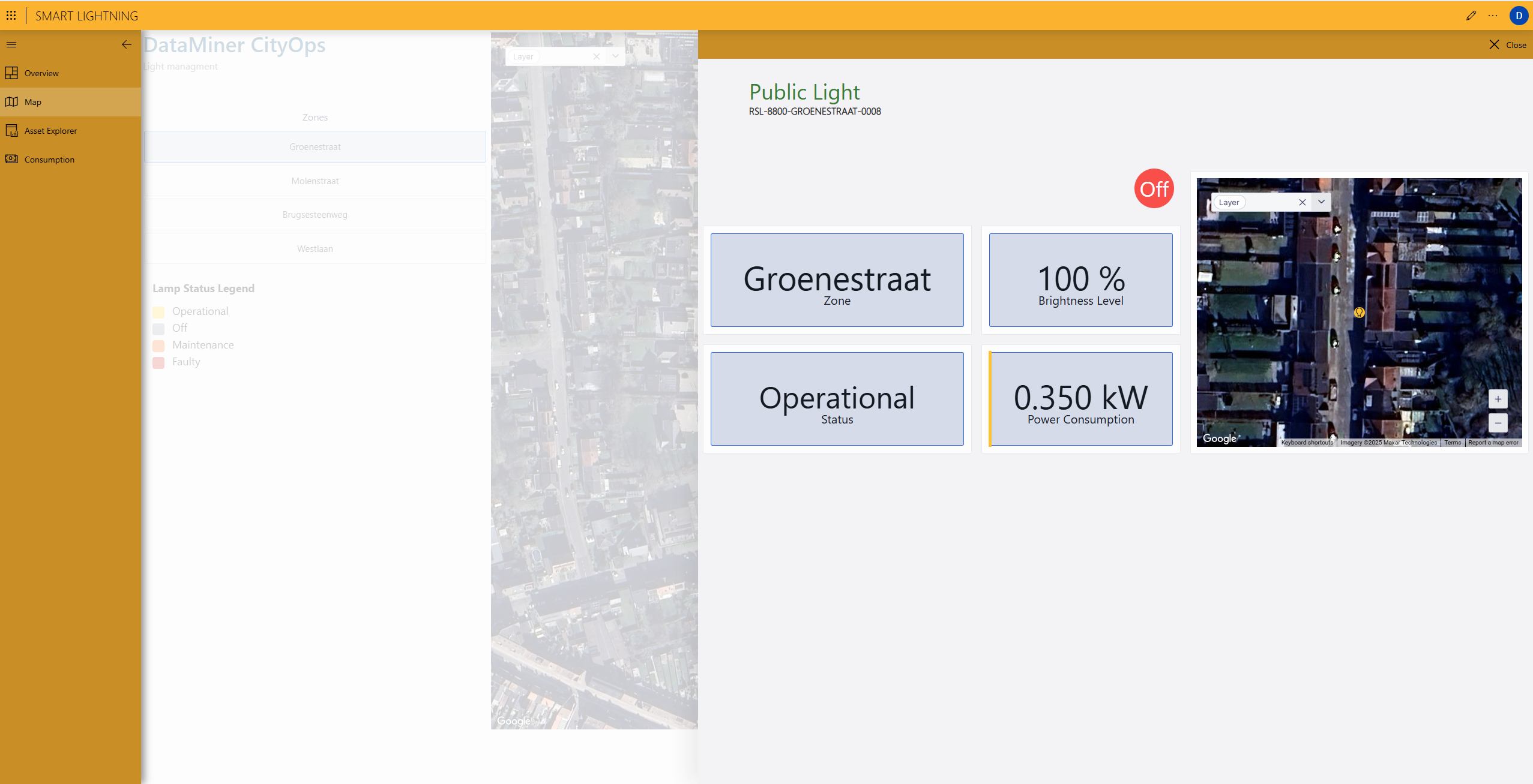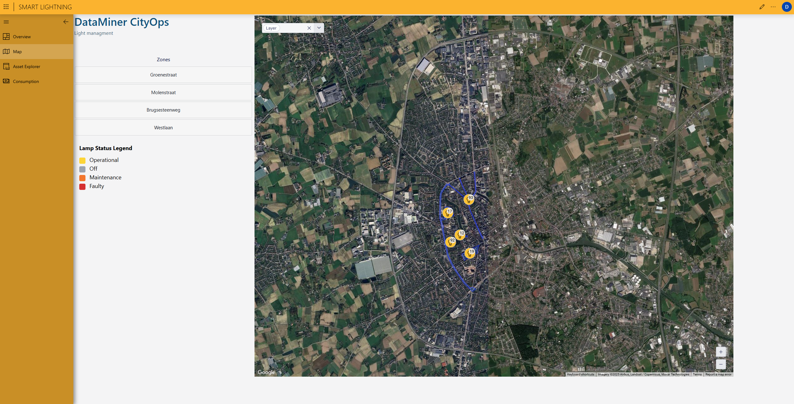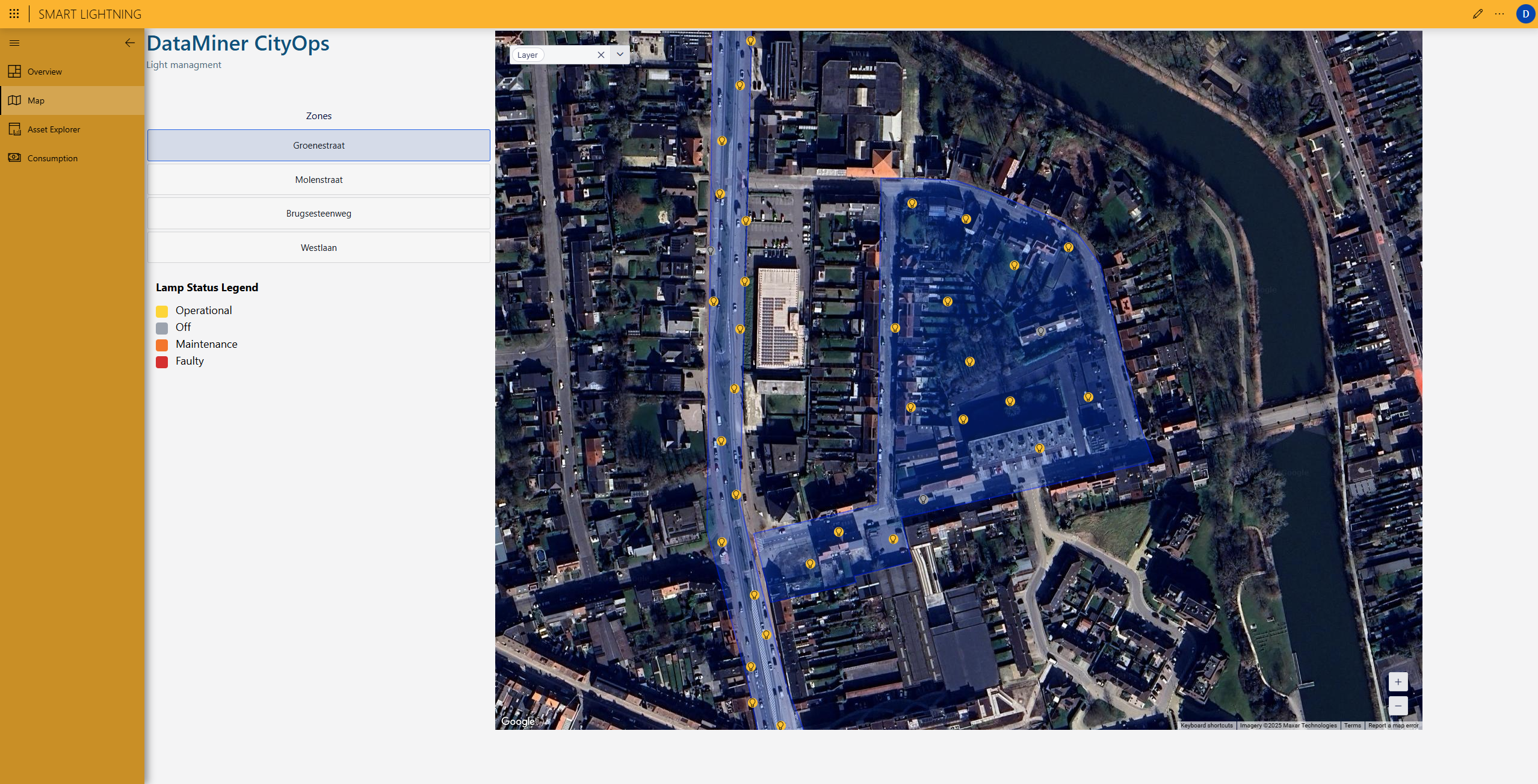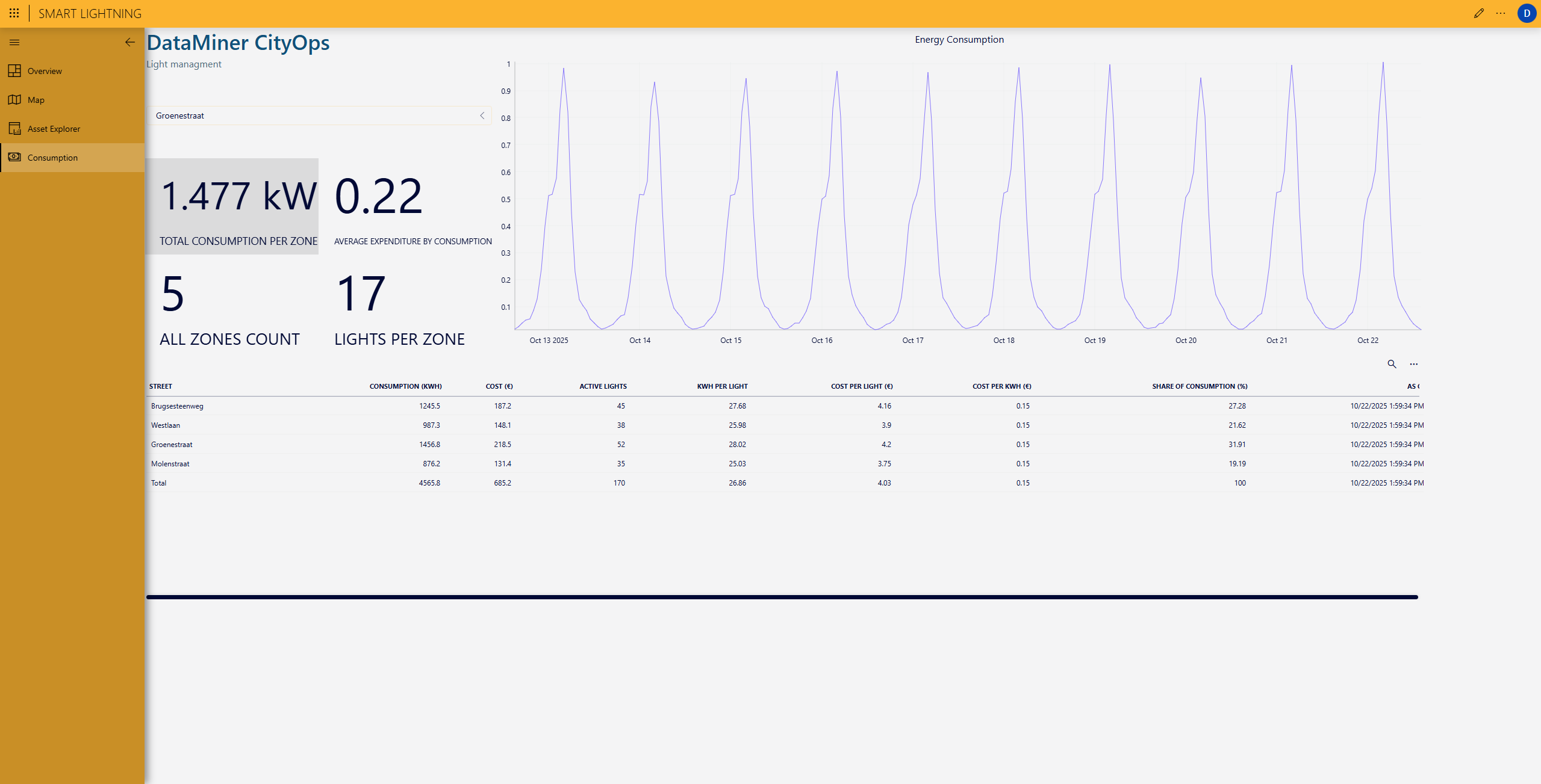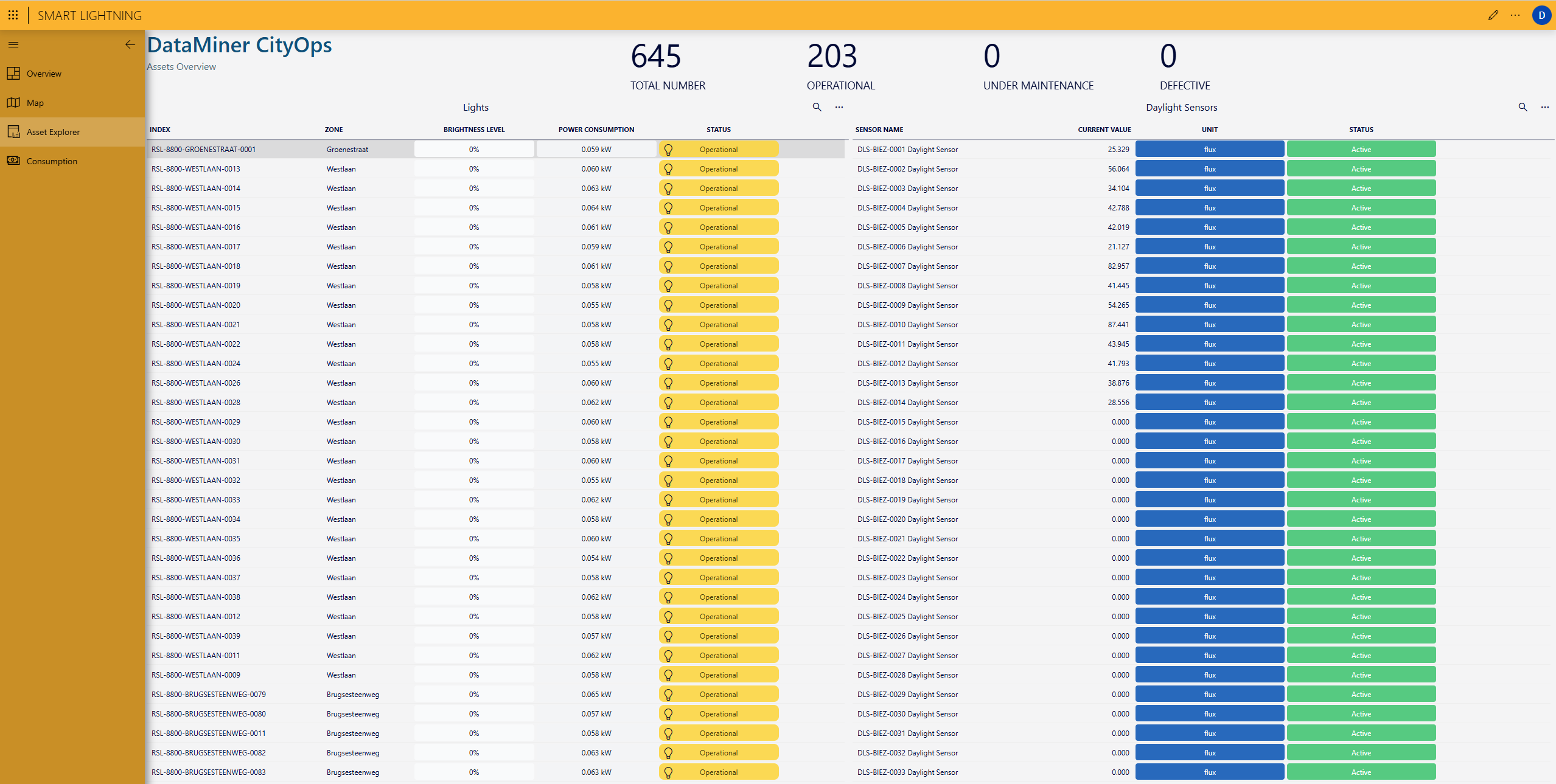 On the Asset Explorer page, all assets are organized in an interactive explorer that combines streetlights and related daylight sensors. The table lists power consumption, brightness, and live sensor readings, offering a complete asset inventory. Fleet totals at the top display how many lights are active, turned off, or under maintenance. This supports lifecycle tracking, warranty management, and planning of proactive replacements.